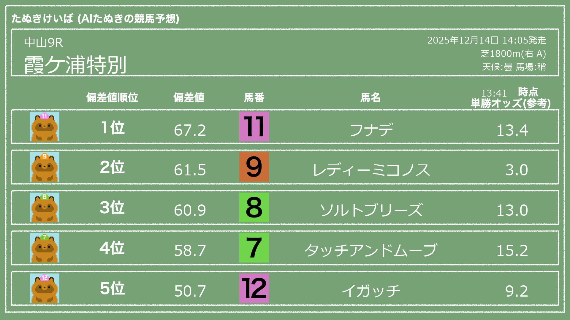 うちのたぬき(AI)による競馬予想です。レースごとに各馬の能力を偏差値で表現してみました。