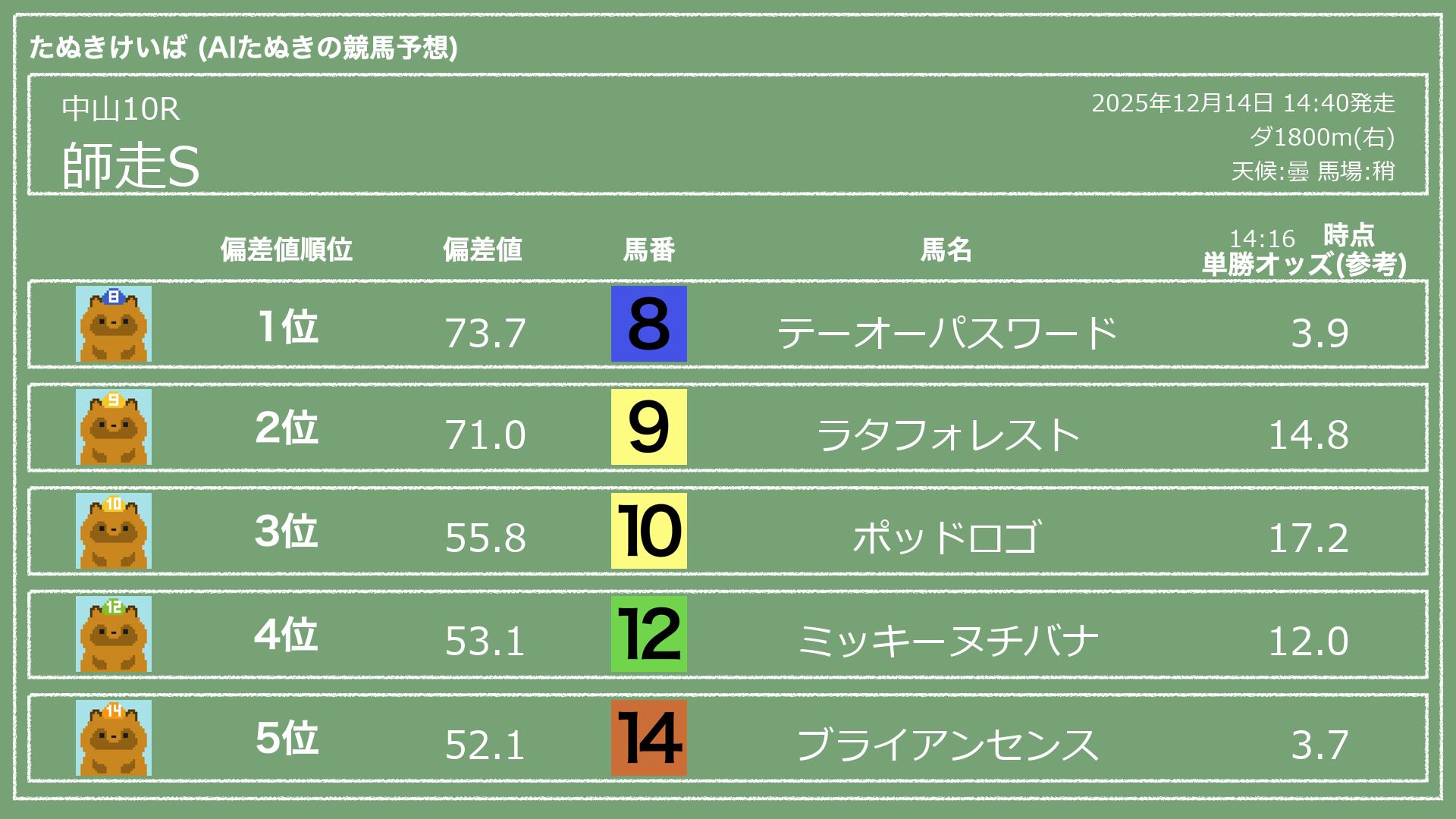 うちのたぬき(AI)による競馬予想です。レースごとに各馬の能力を偏差値で表現してみました。