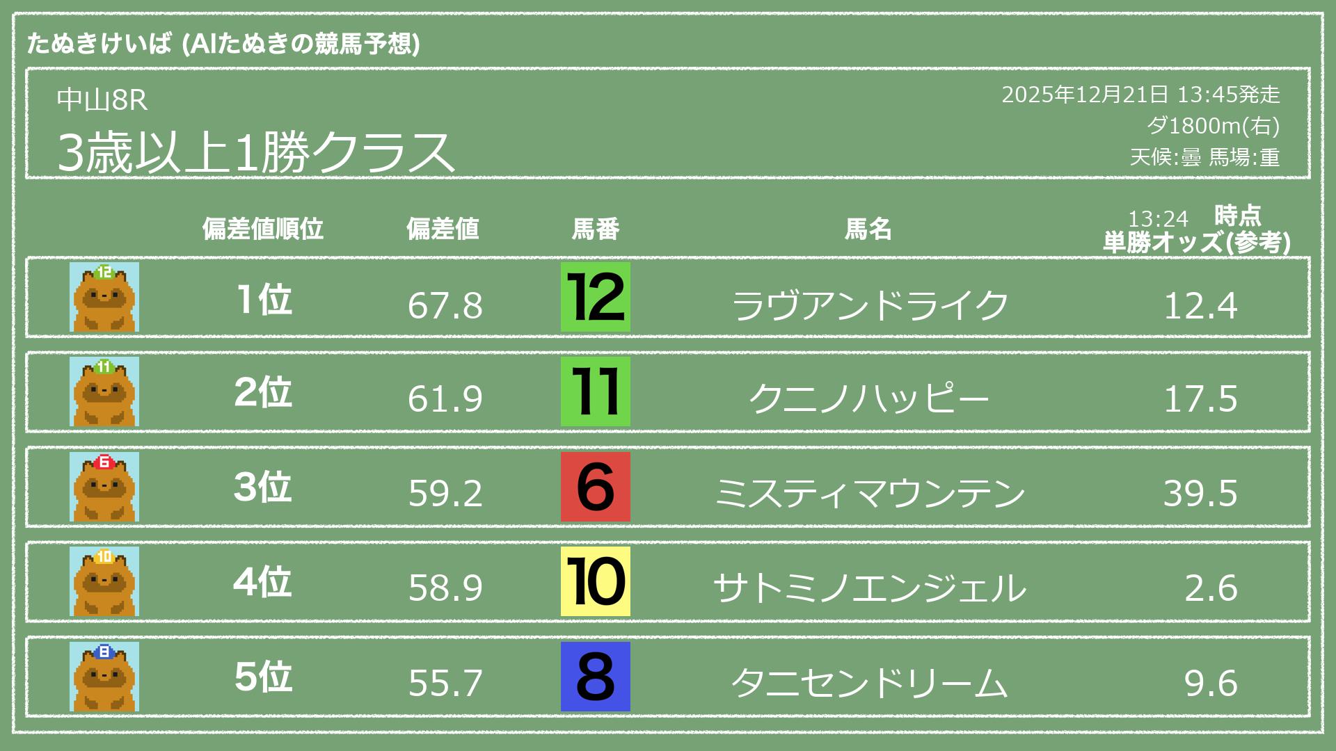 うちのたぬき(AI)による競馬予想です。レースごとに各馬の能力を偏差値で表現してみました。