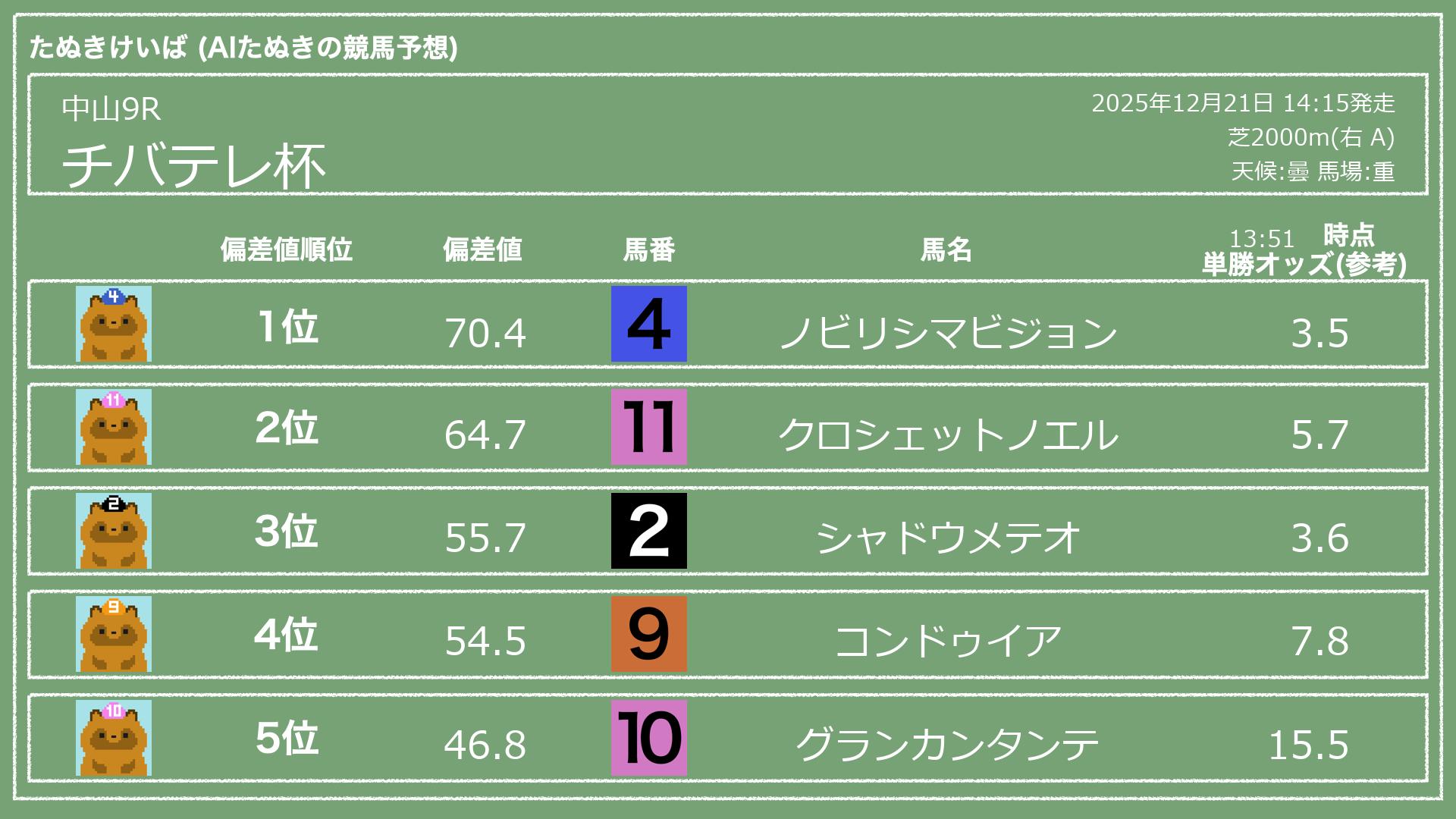 うちのたぬき(AI)による競馬予想です。レースごとに各馬の能力を偏差値で表現してみました。