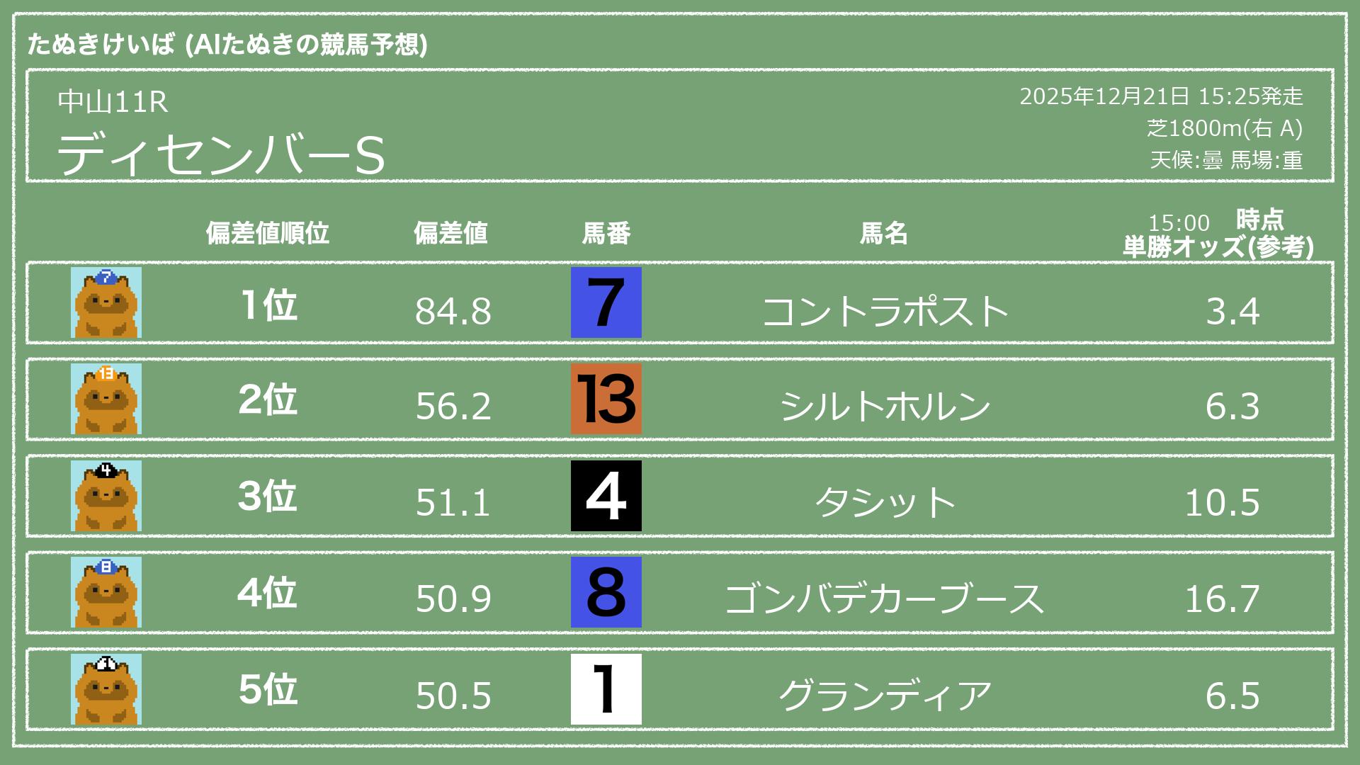 うちのたぬき(AI)による競馬予想です。レースごとに各馬の能力を偏差値で表現してみました。