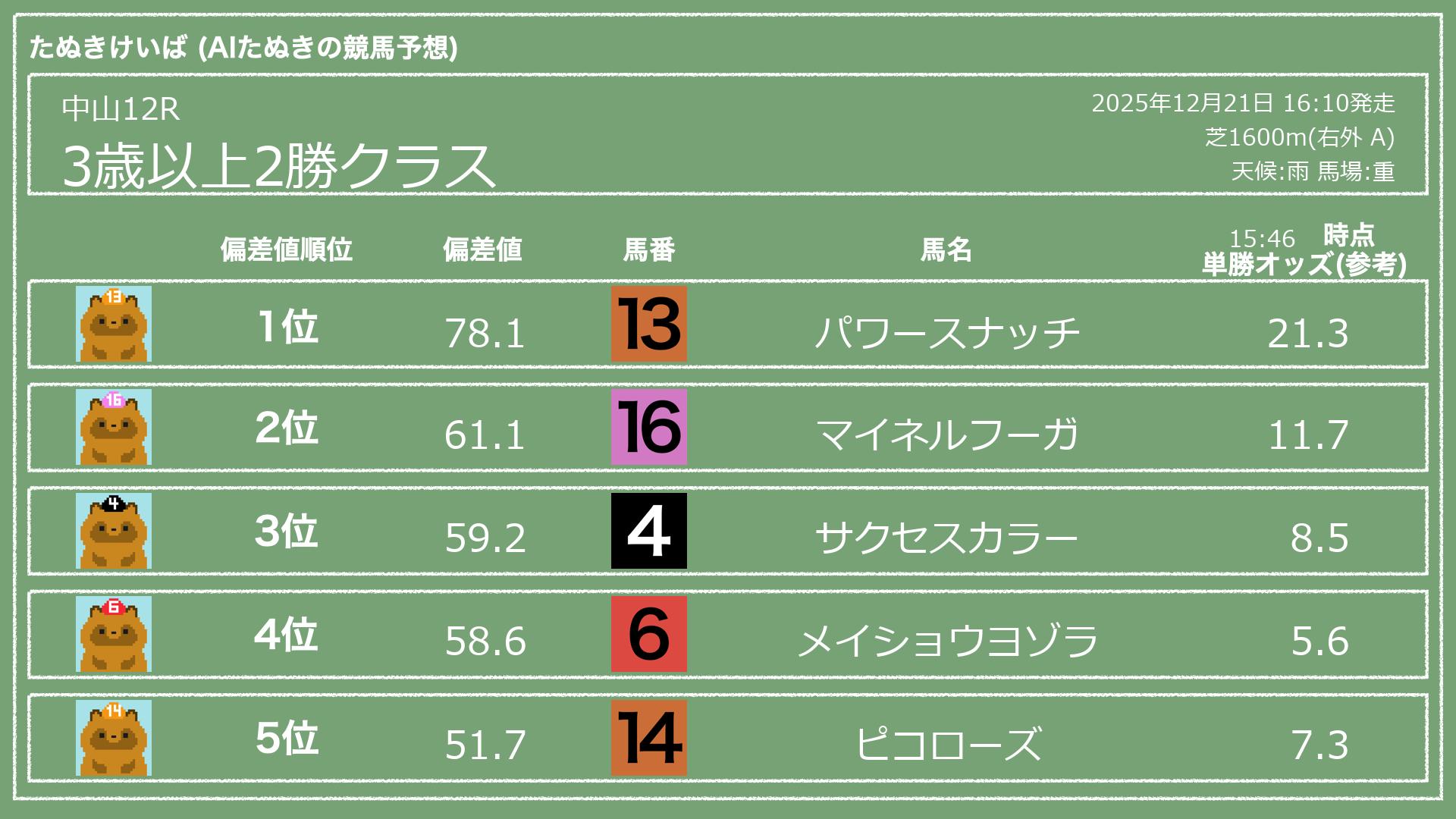 うちのたぬき(AI)による競馬予想です。レースごとに各馬の能力を偏差値で表現してみました。