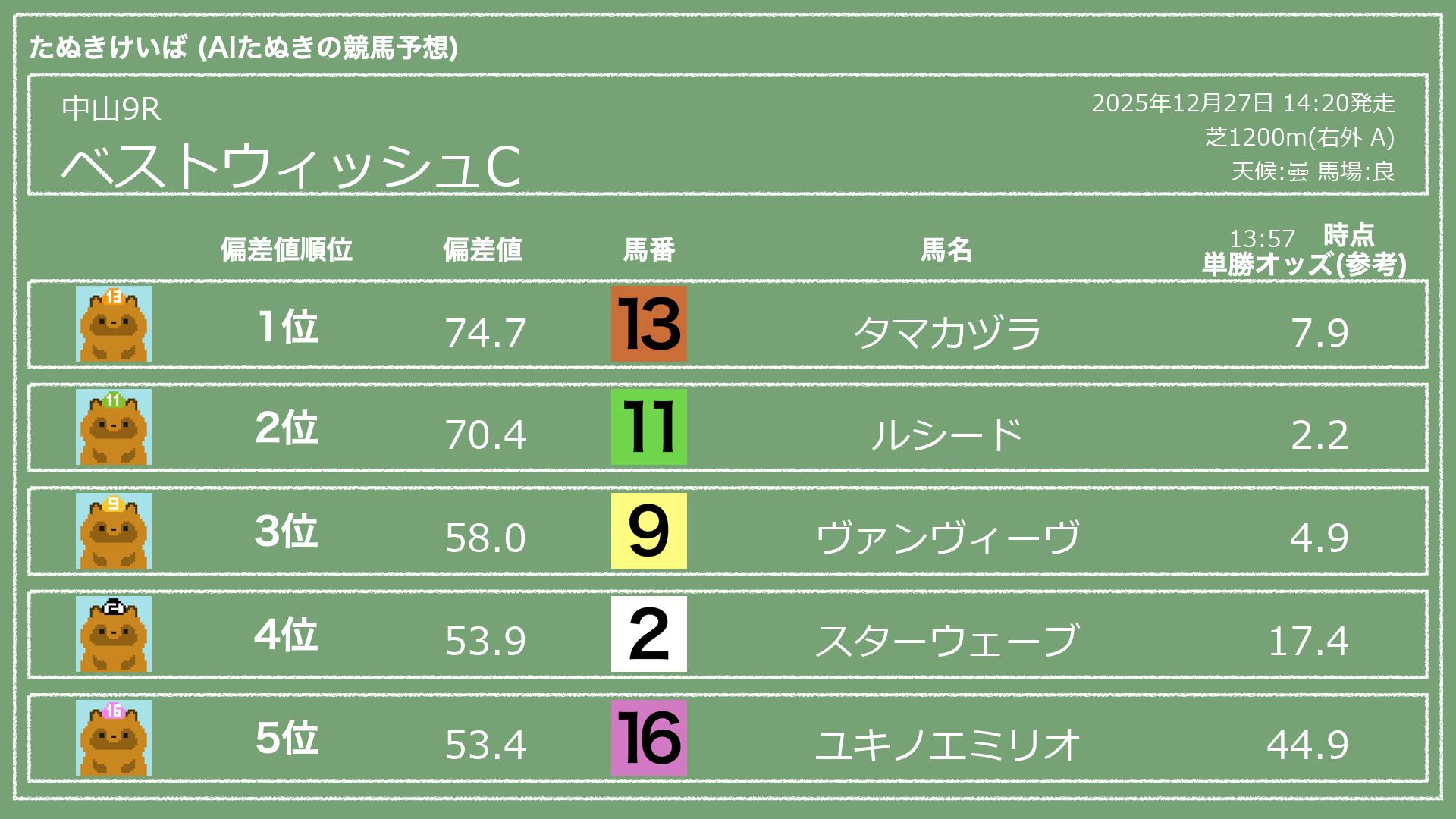 うちのたぬき(AI)による競馬予想です。