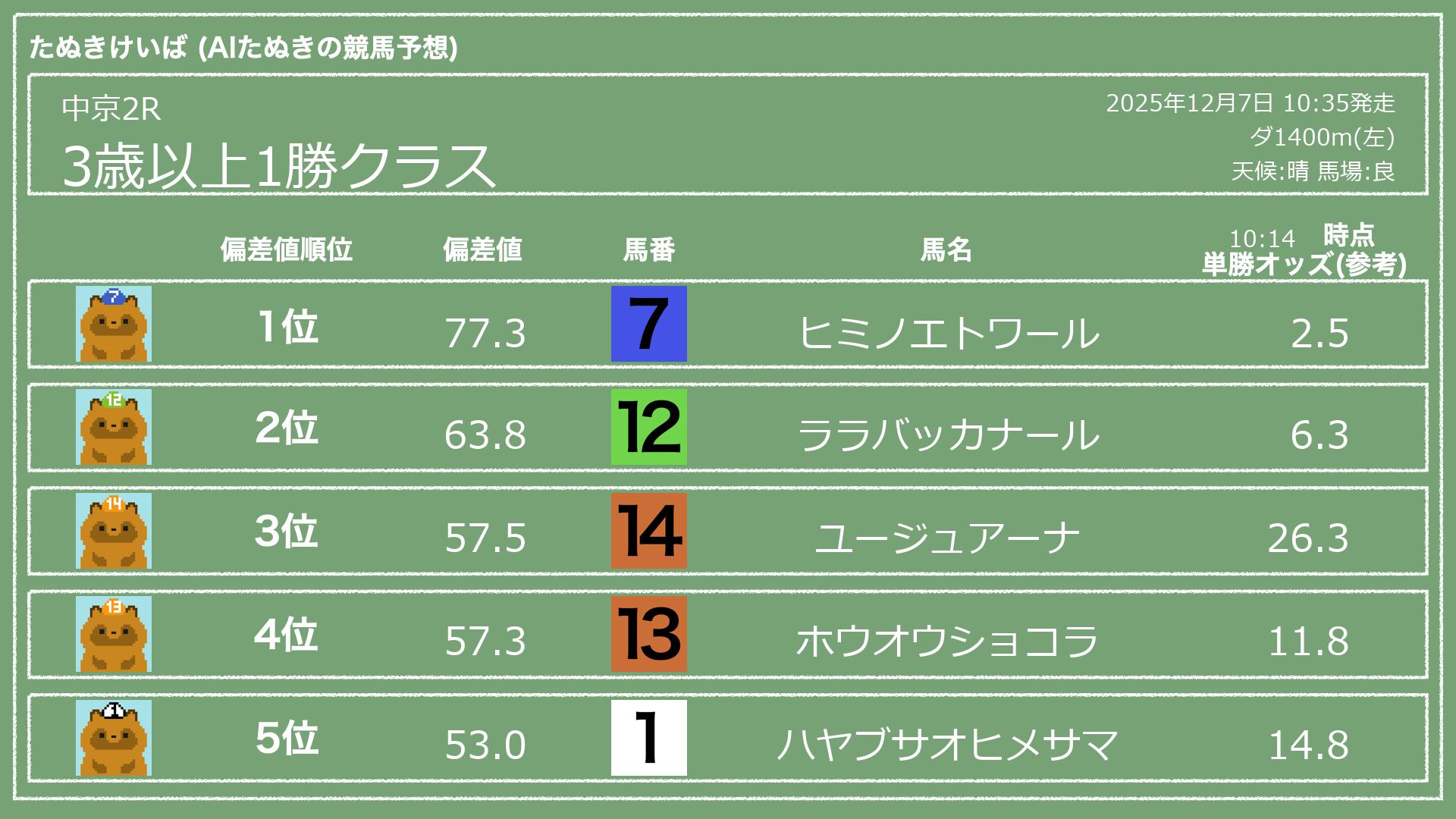 うちのたぬき(AI)による競馬予想です。レースごとに各馬の能力を偏差値で表現してみました。