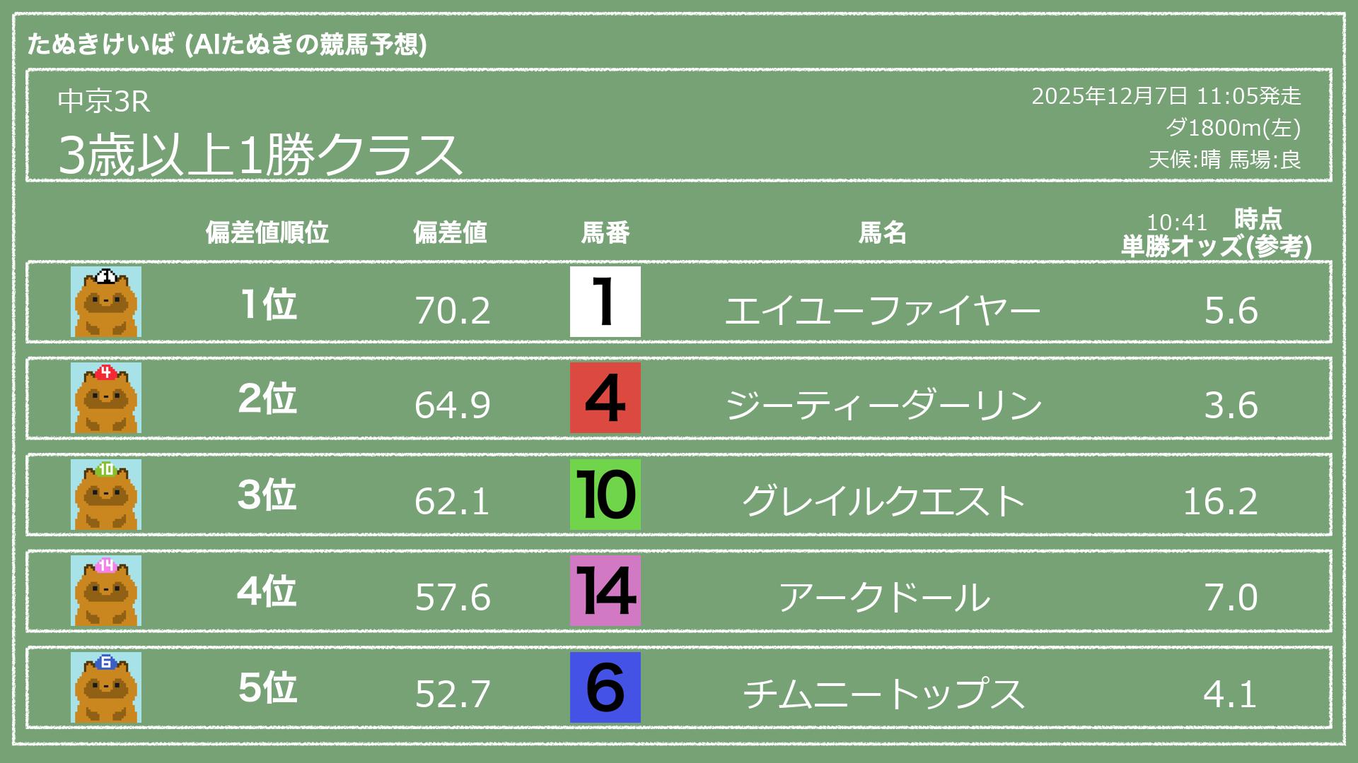 うちのたぬき(AI)による競馬予想です。レースごとに各馬の能力を偏差値で表現してみました。