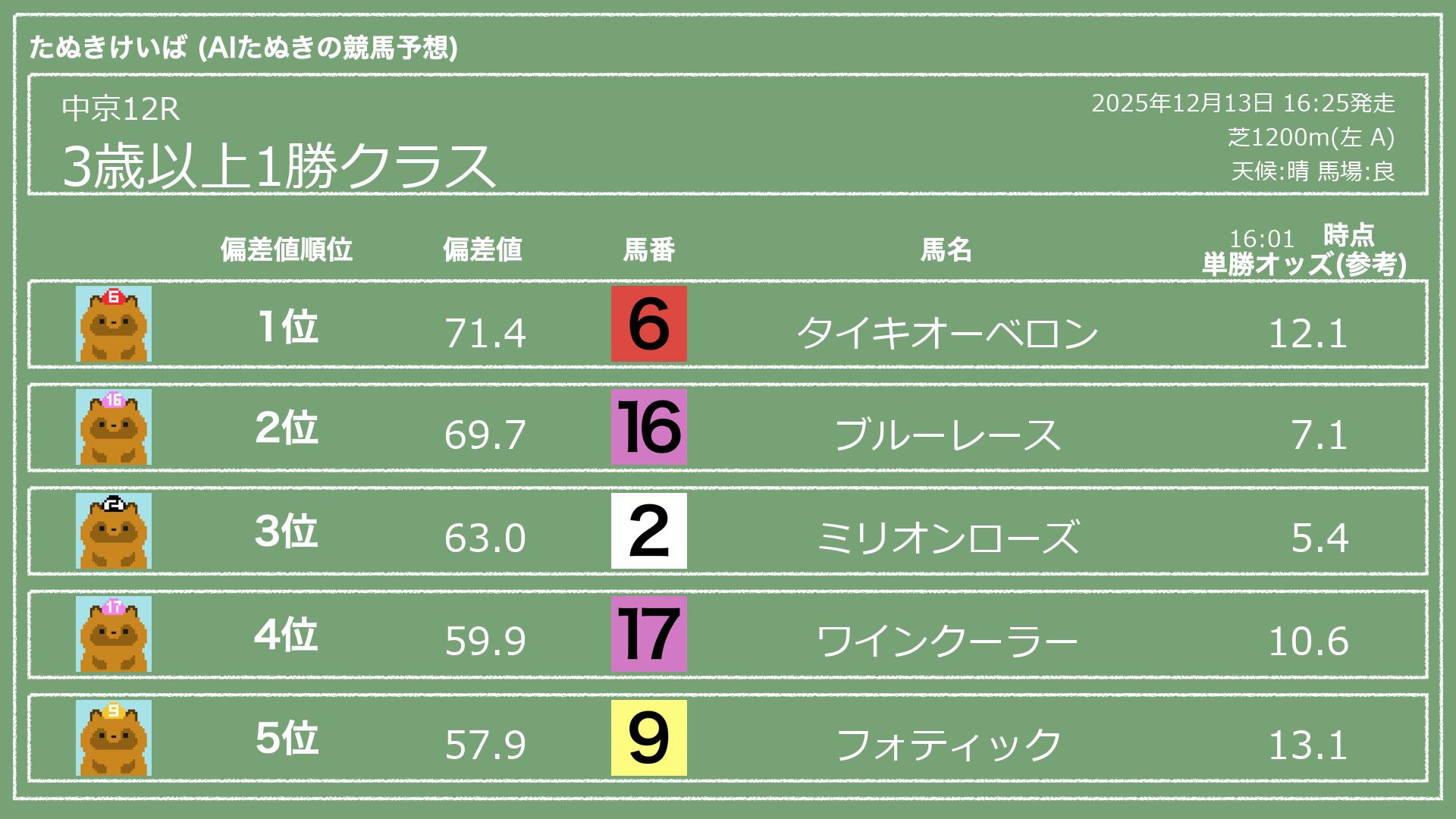 うちのたぬき(AI)による競馬予想です。レースごとに各馬の能力を偏差値で表現してみました。