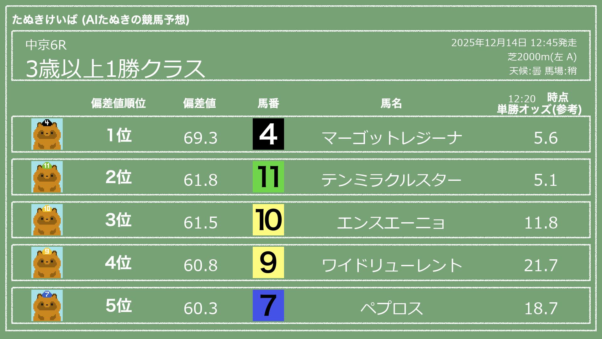 うちのたぬき(AI)による競馬予想です。レースごとに各馬の能力を偏差値で表現してみました。