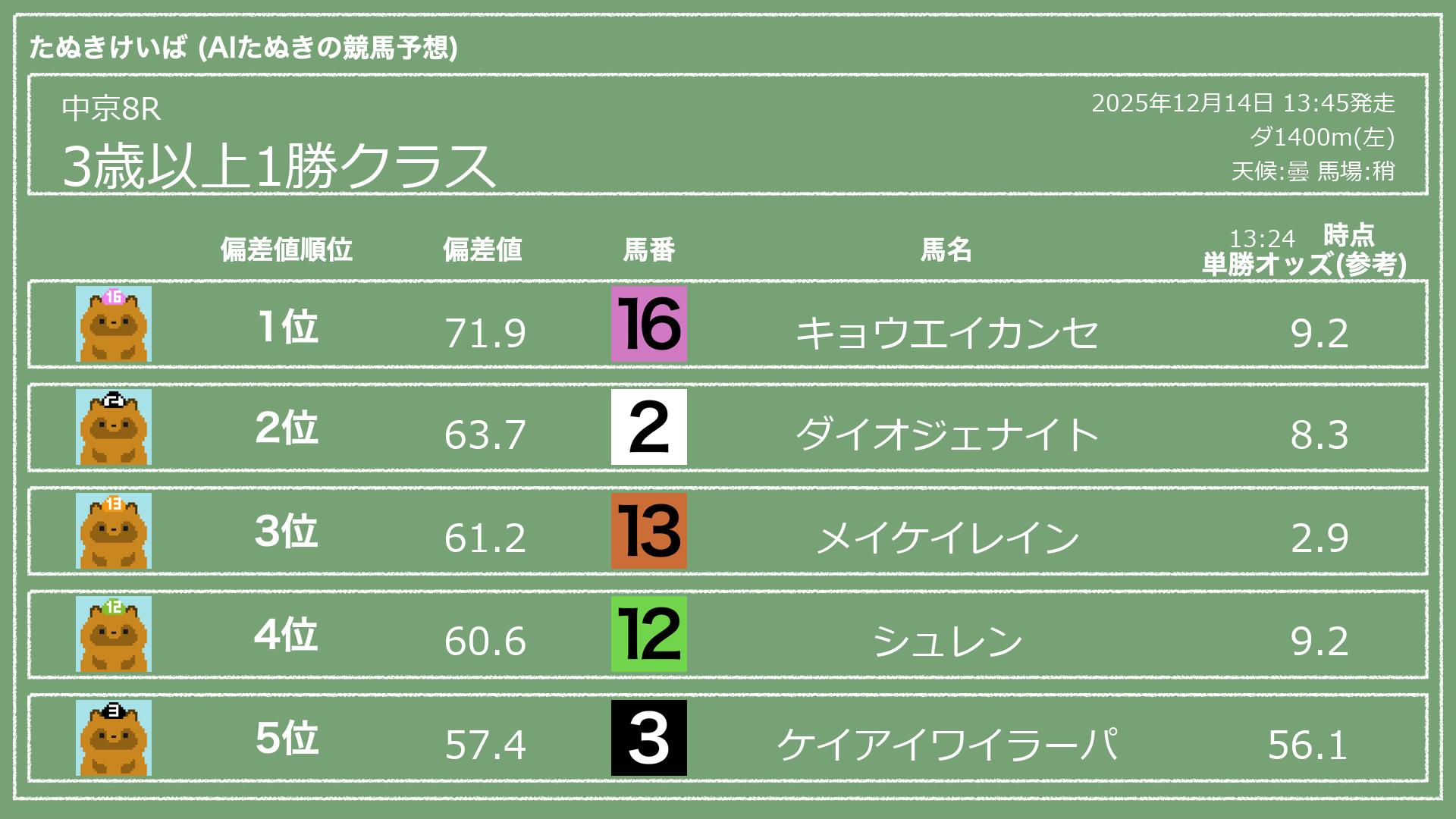 うちのたぬき(AI)による競馬予想です。レースごとに各馬の能力を偏差値で表現してみました。