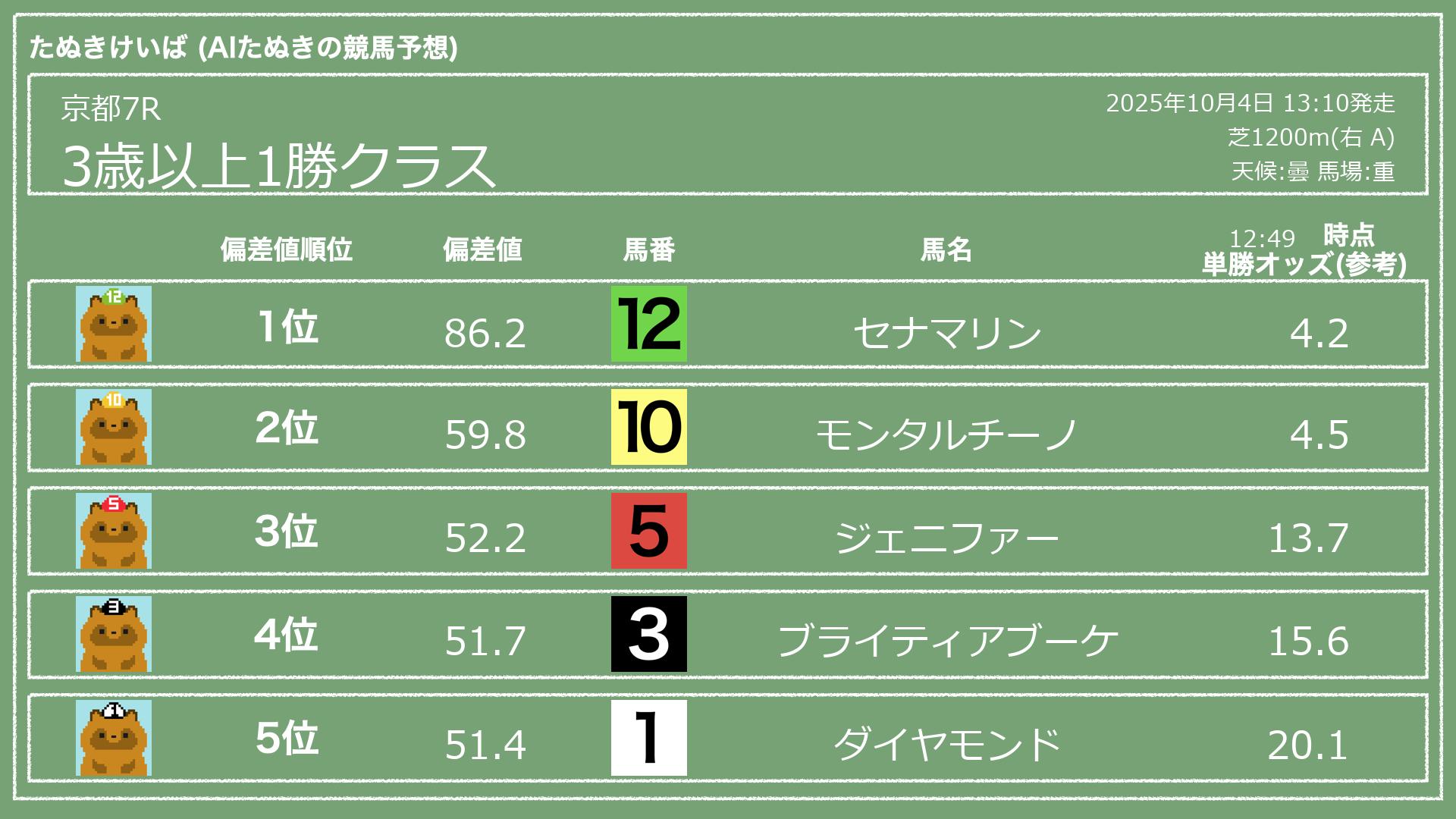 うちのたぬき(AI)による競馬予想です。レースごとに各馬の能力を偏差値で表現してみました。