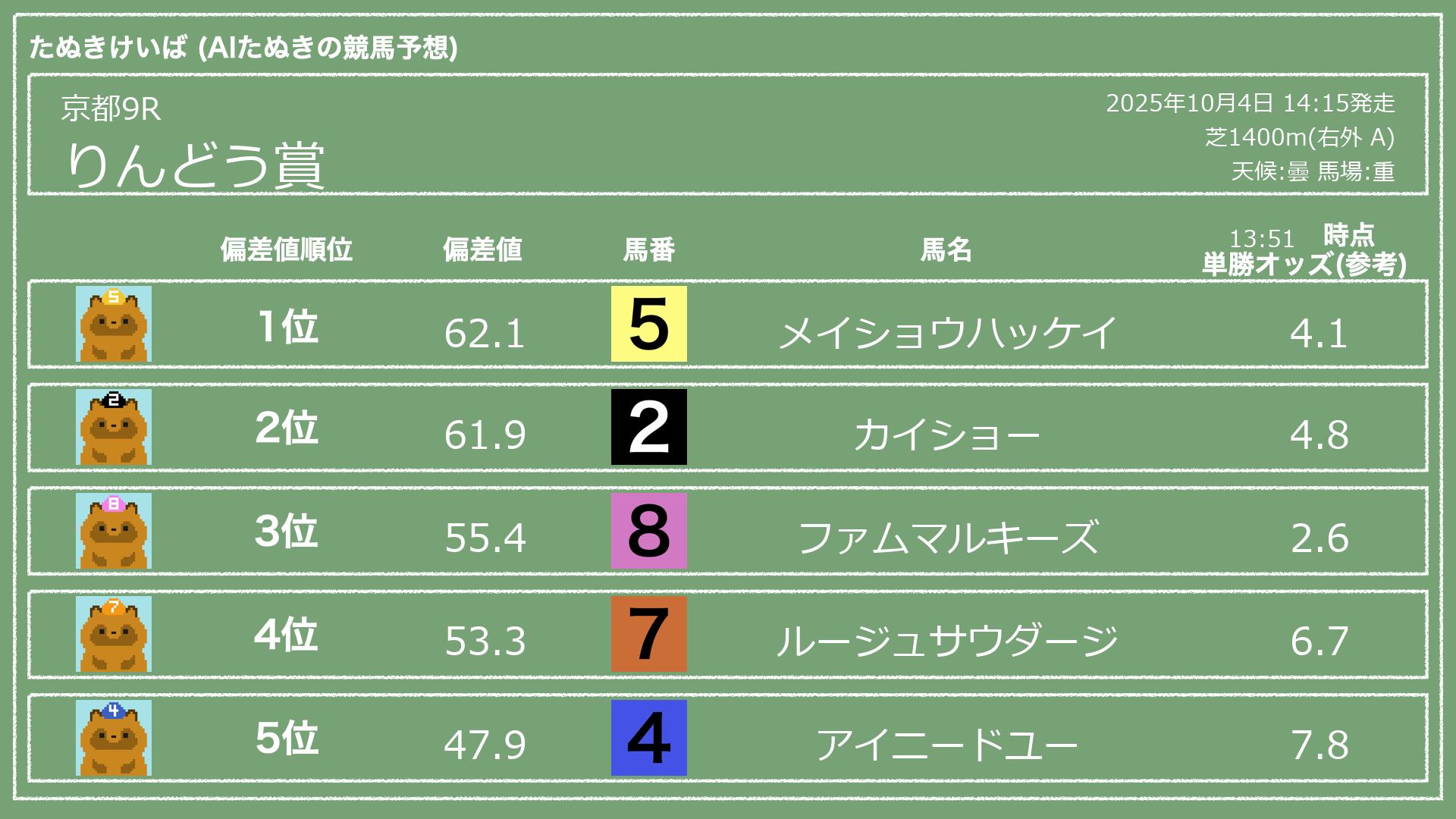 うちのたぬき(AI)による競馬予想です。レースごとに各馬の能力を偏差値で表現してみました。