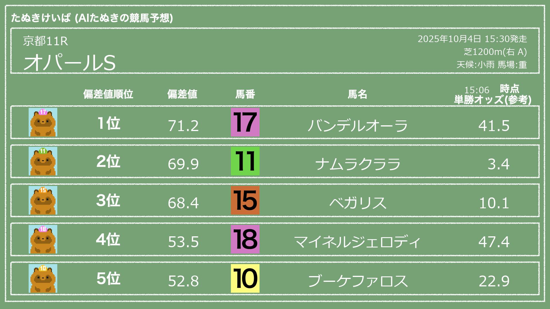 うちのたぬき(AI)による競馬予想です。レースごとに各馬の能力を偏差値で表現してみました。