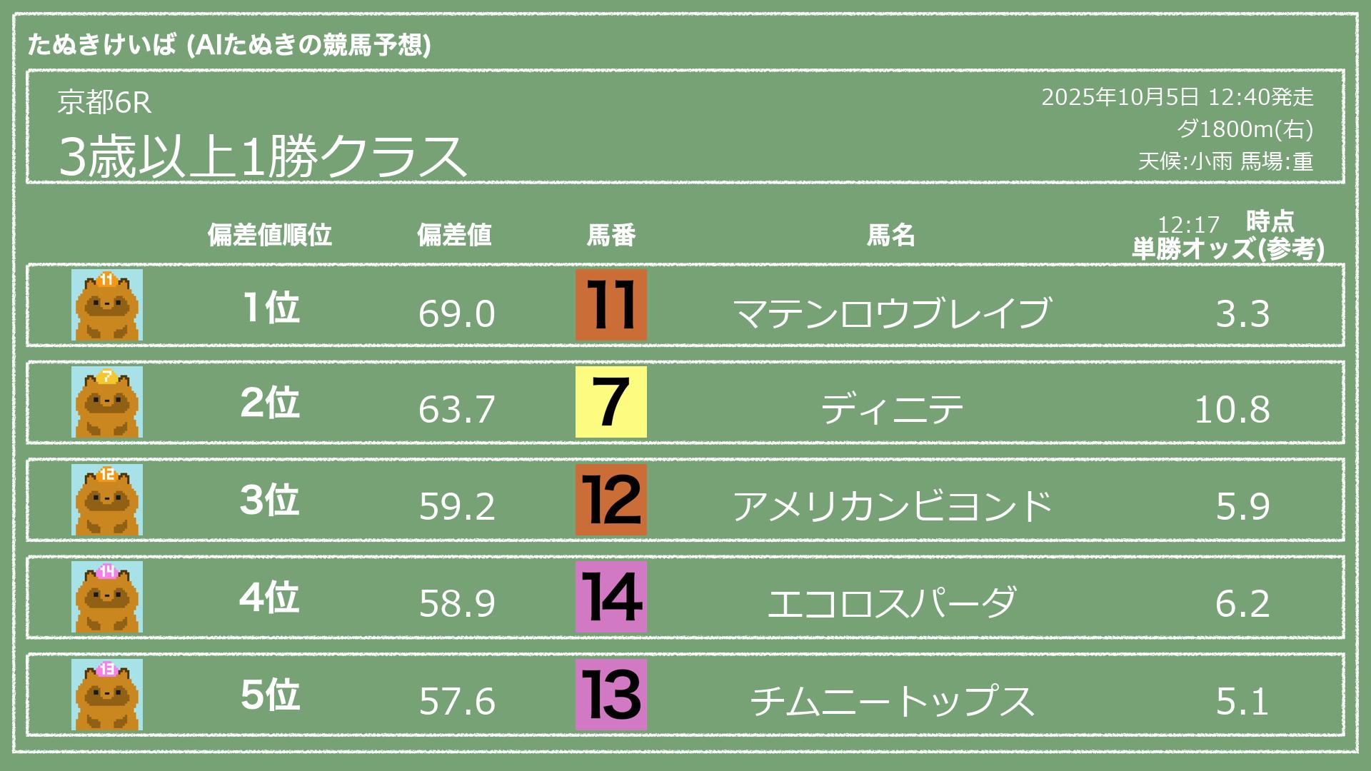うちのたぬき(AI)による競馬予想です。レースごとに各馬の能力を偏差値で表現してみました。