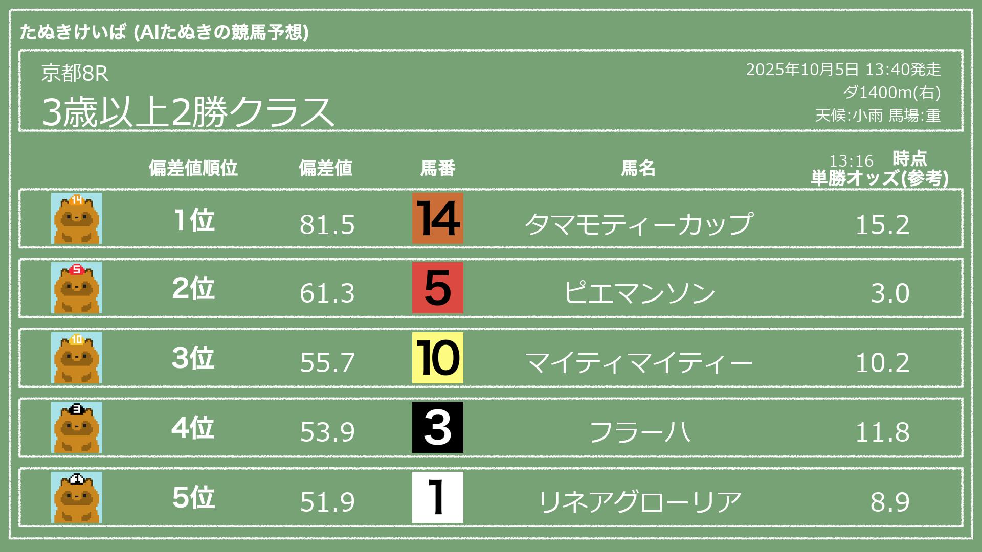 うちのたぬき(AI)による競馬予想です。レースごとに各馬の能力を偏差値で表現してみました。