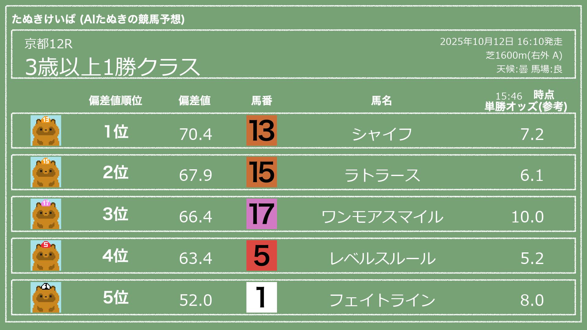 うちのたぬき(AI)による競馬予想です。レースごとに各馬の能力を偏差値で表現してみました。