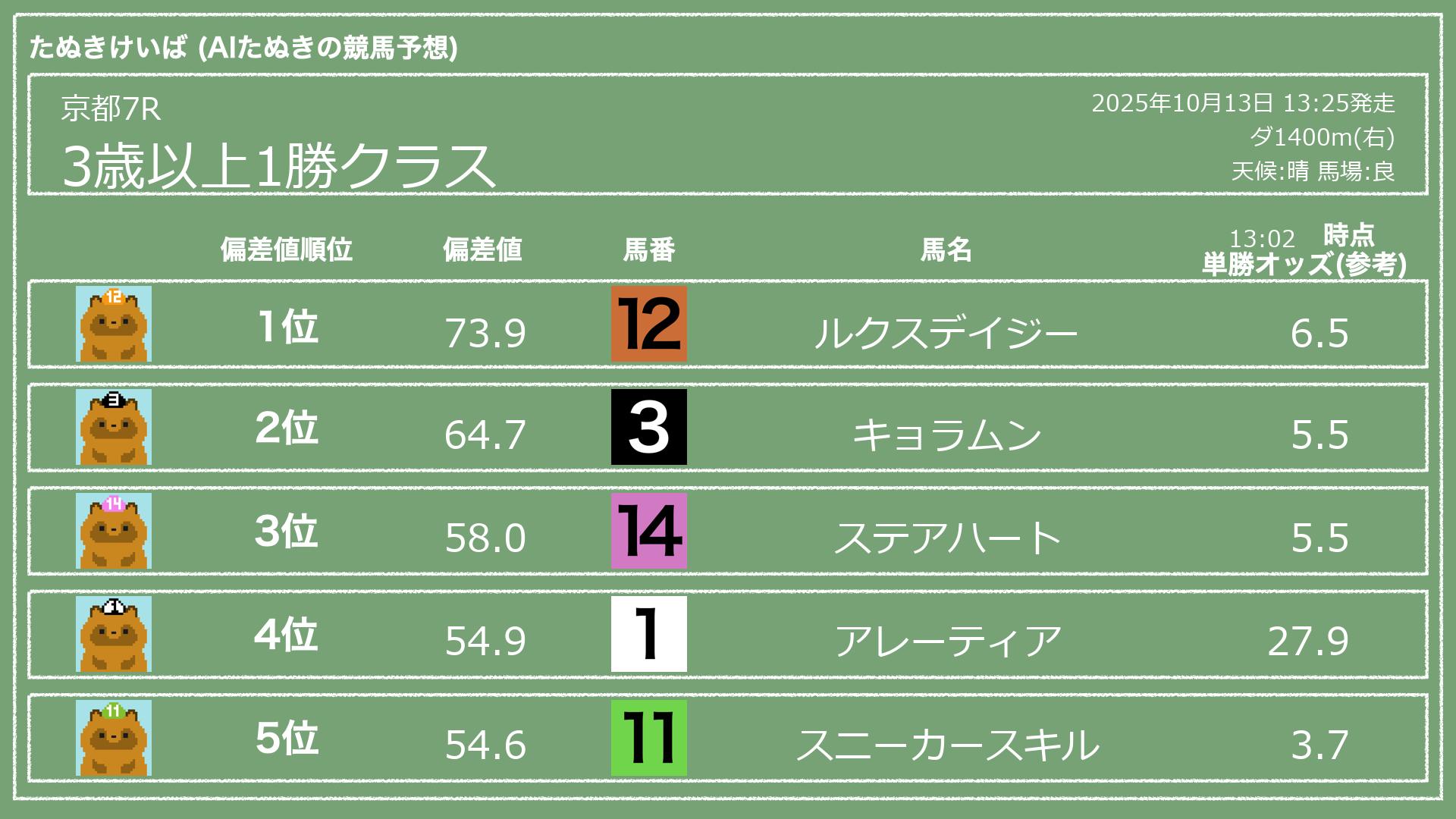 うちのたぬき(AI)による競馬予想です。レースごとに各馬の能力を偏差値で表現してみました。
