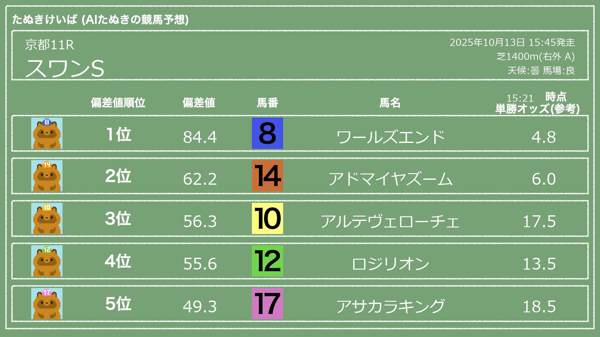うちのたぬき(AI)による競馬予想です。レースごとに各馬の能力を偏差値で表現してみました。