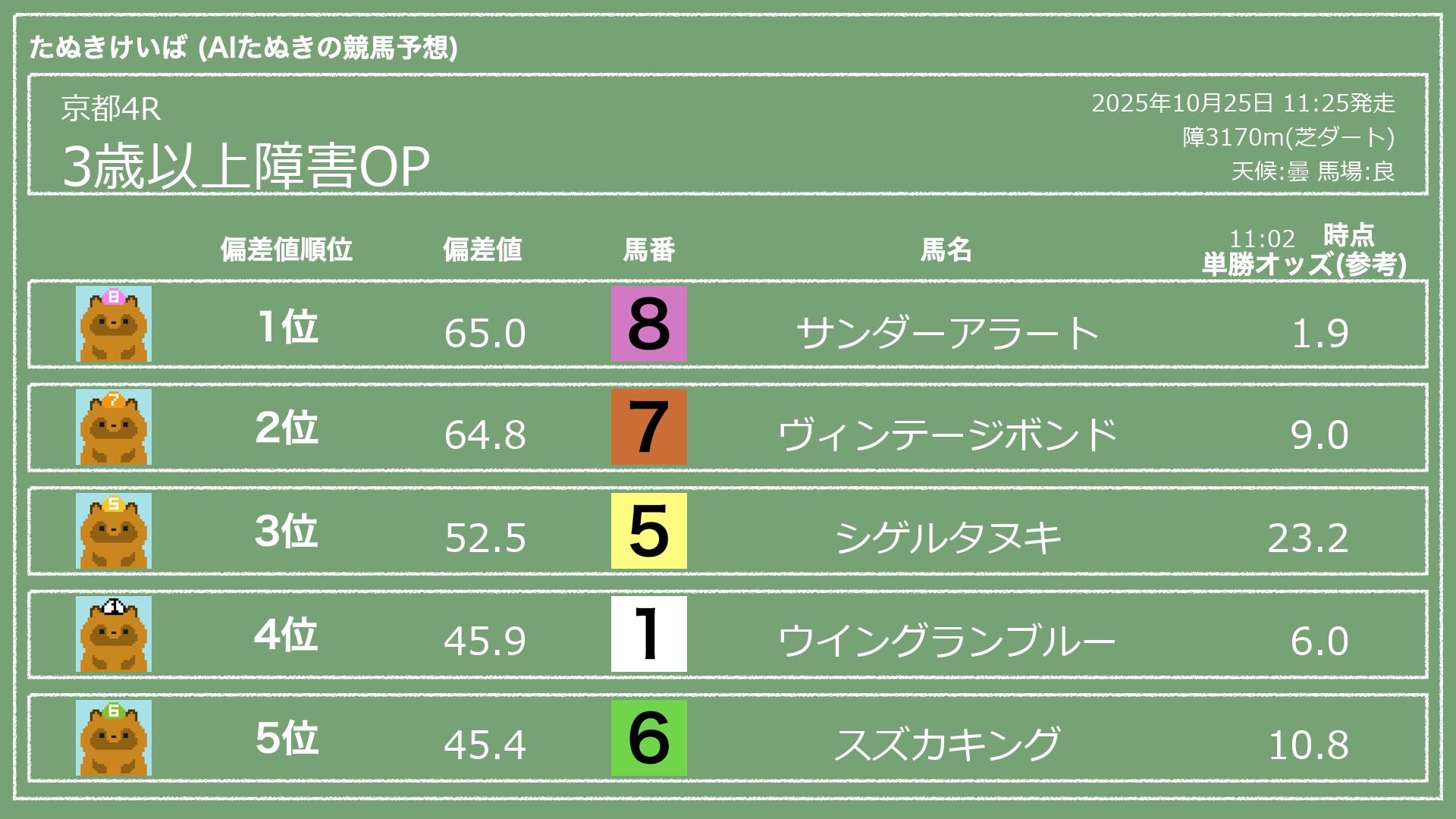 うちのたぬき(AI)による競馬予想です。レースごとに各馬の能力を偏差値で表現してみました。