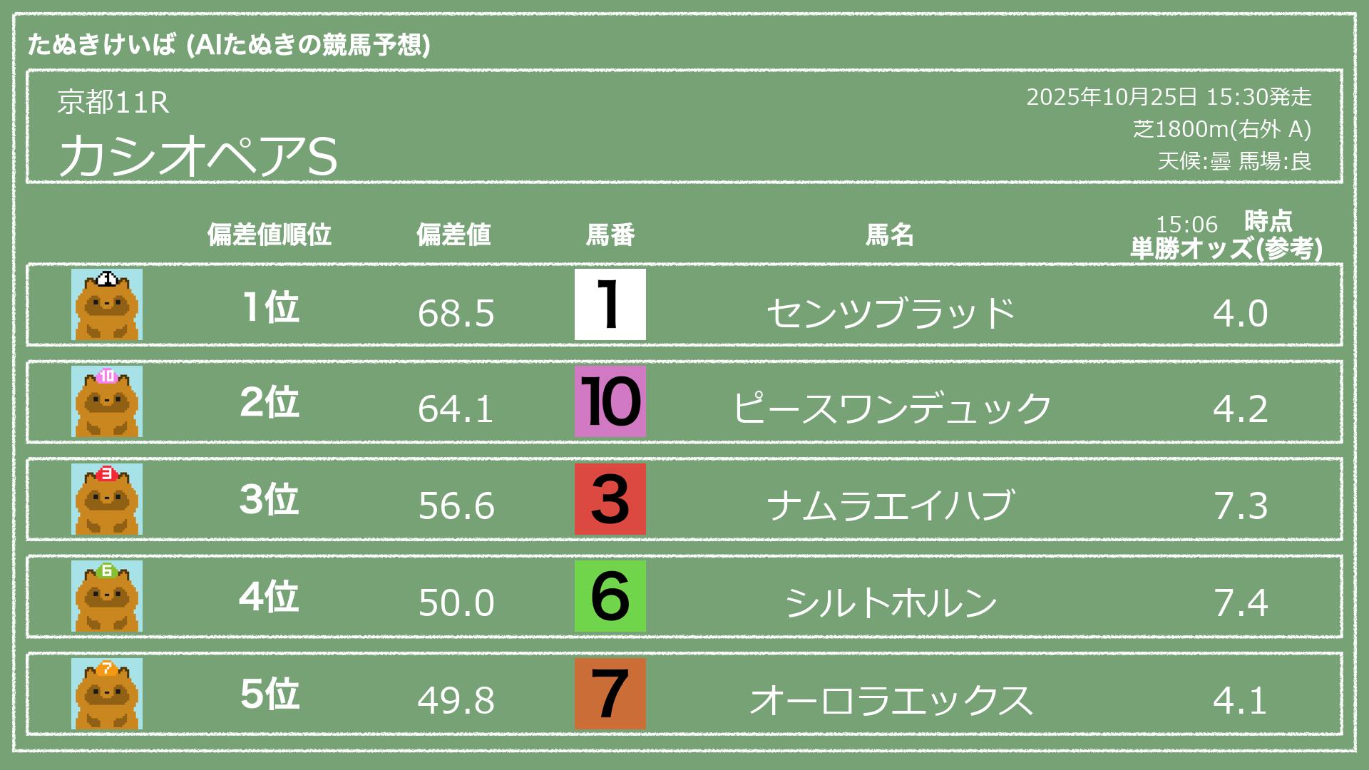うちのたぬき(AI)による競馬予想です。レースごとに各馬の能力を偏差値で表現してみました。