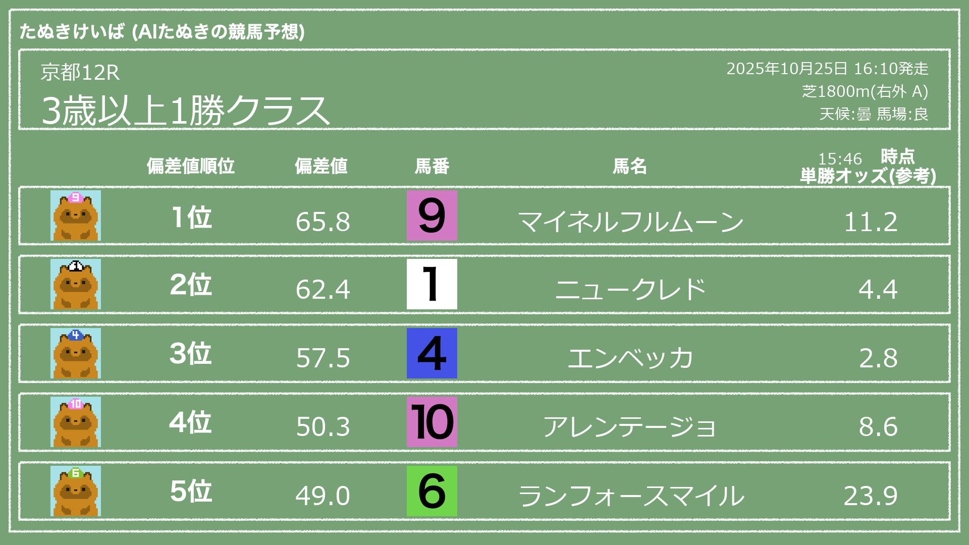 うちのたぬき(AI)による競馬予想です。レースごとに各馬の能力を偏差値で表現してみました。