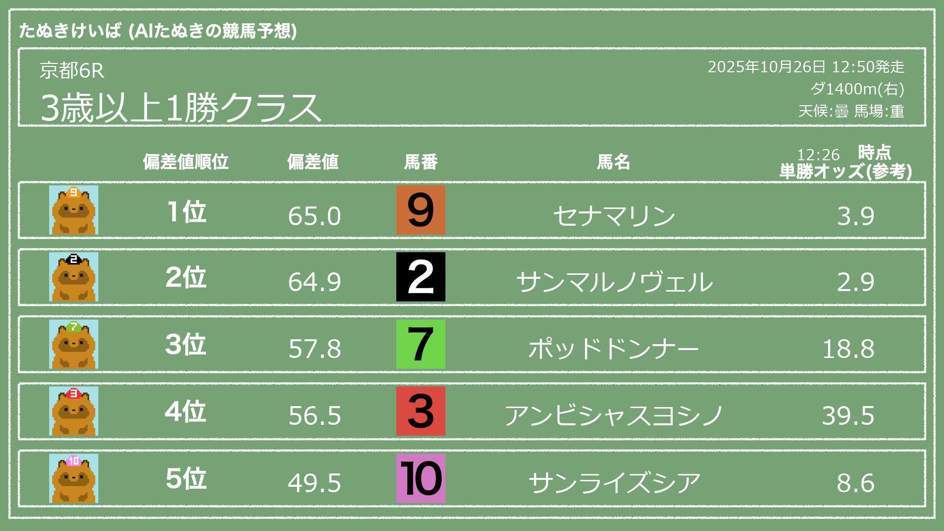うちのたぬき(AI)による競馬予想です。レースごとに各馬の能力を偏差値で表現してみました。