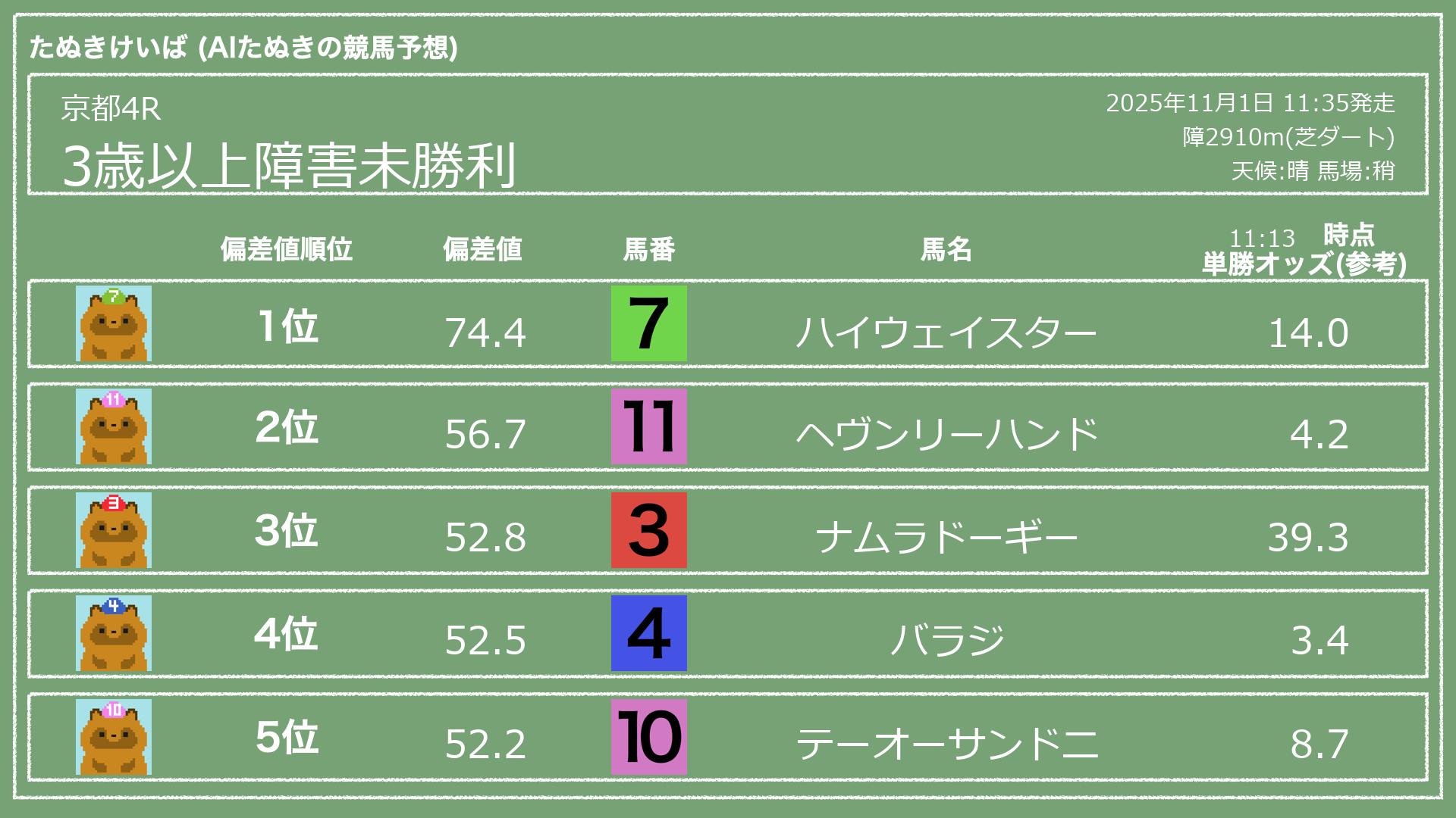 うちのたぬき(AI)による競馬予想です。レースごとに各馬の能力を偏差値で表現してみました。
