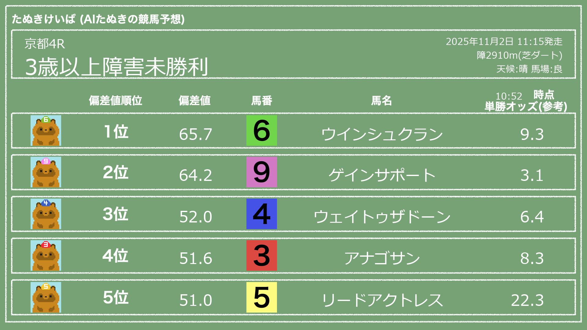 うちのたぬき(AI)による競馬予想です。レースごとに各馬の能力を偏差値で表現してみました。