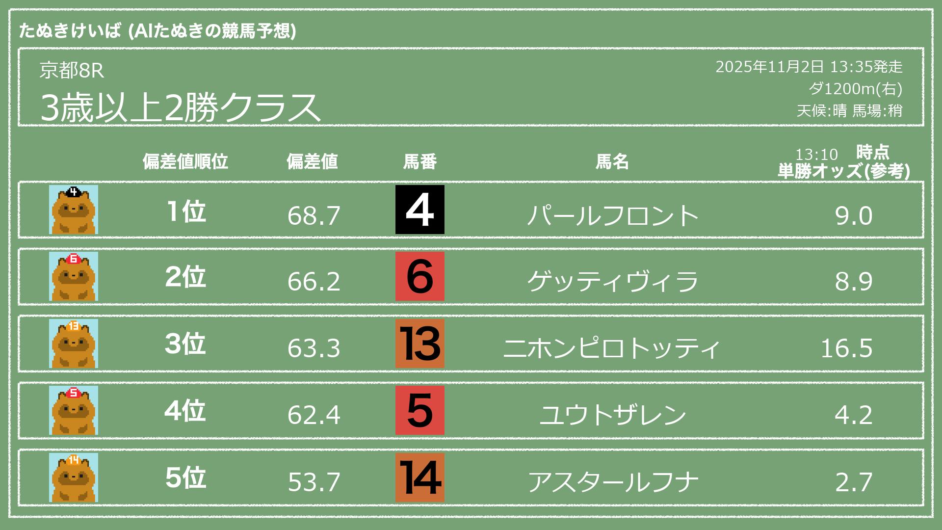 うちのたぬき(AI)による競馬予想です。レースごとに各馬の能力を偏差値で表現してみました。