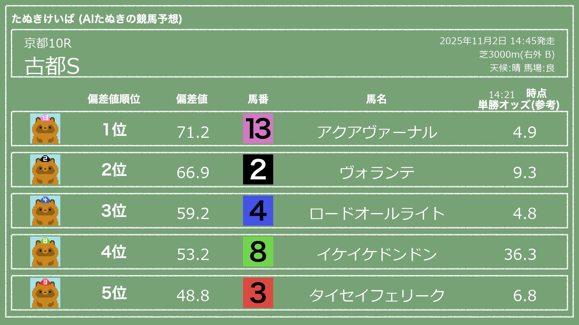 うちのたぬき(AI)による競馬予想です。レースごとに各馬の能力を偏差値で表現してみました。