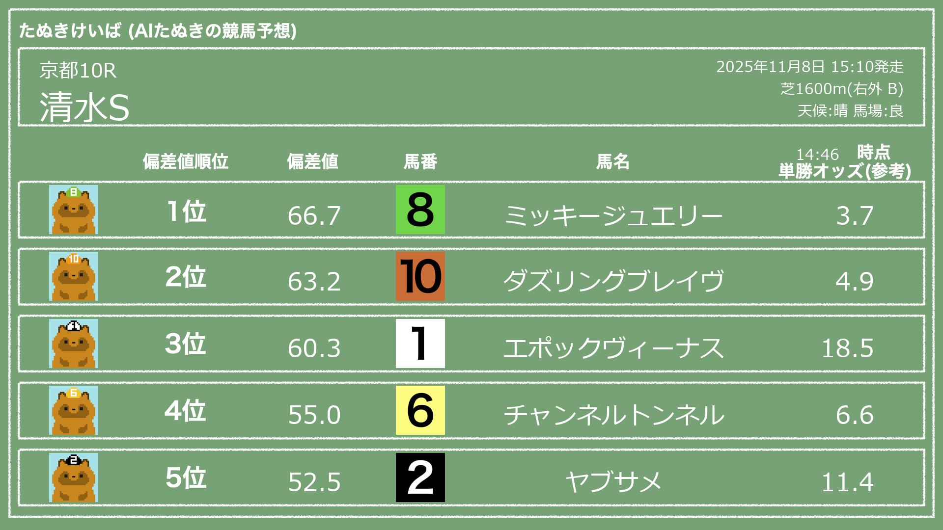 うちのたぬき(AI)による競馬予想です。レースごとに各馬の能力を偏差値で表現してみました。