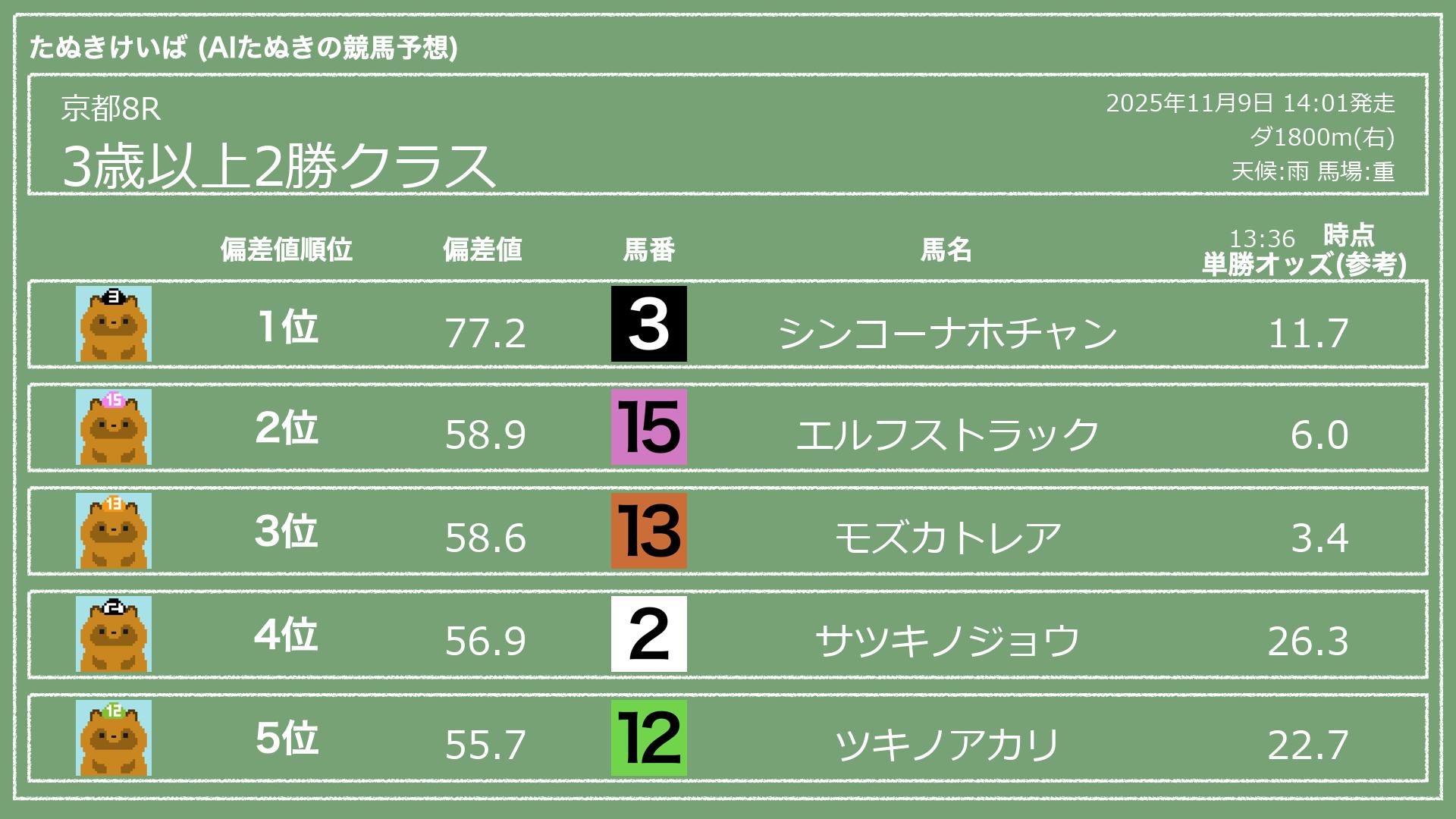 うちのたぬき(AI)による競馬予想です。レースごとに各馬の能力を偏差値で表現してみました。