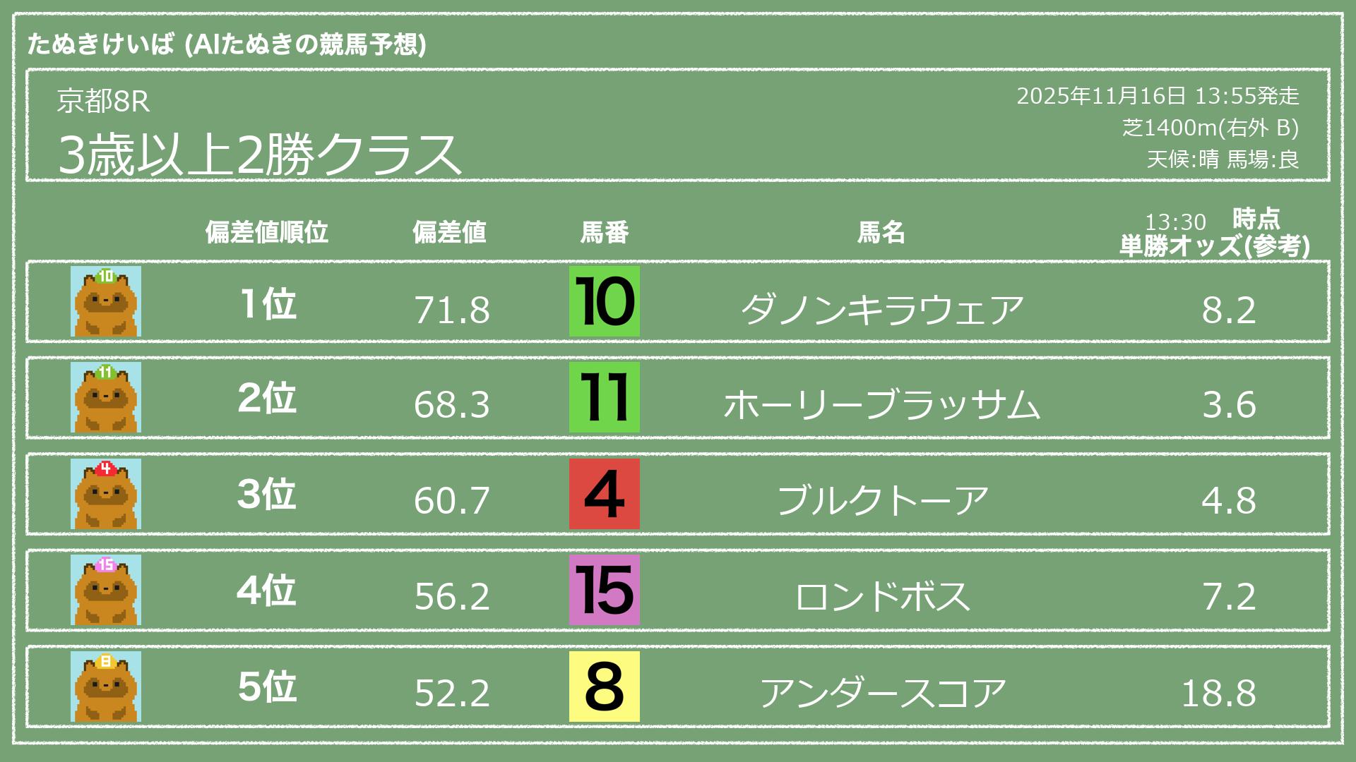 うちのたぬき(AI)による競馬予想です。レースごとに各馬の能力を偏差値で表現してみました。