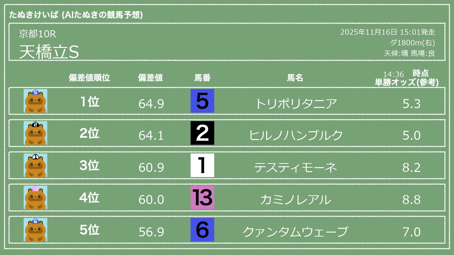 うちのたぬき(AI)による競馬予想です。レースごとに各馬の能力を偏差値で表現してみました。