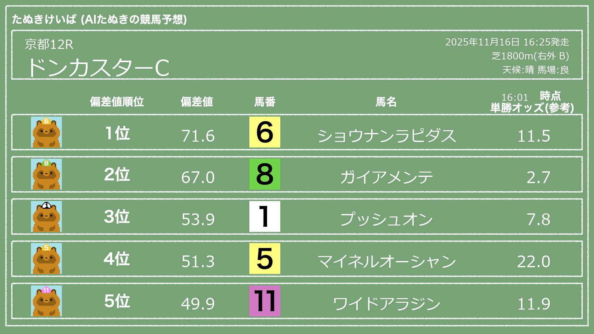 うちのたぬき(AI)による競馬予想です。レースごとに各馬の能力を偏差値で表現してみました。