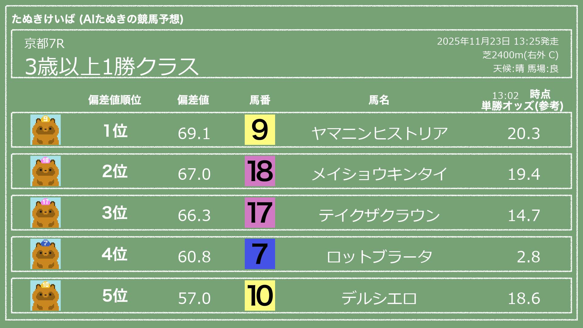 うちのたぬき(AI)による競馬予想です。