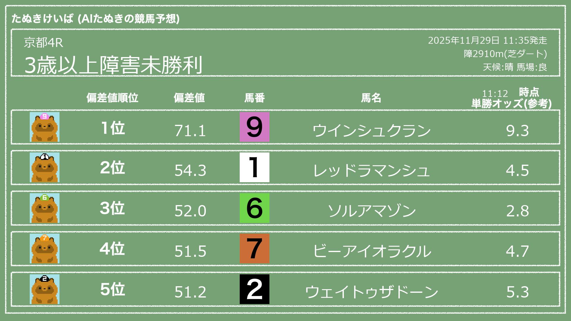 うちのたぬき(AI)による競馬予想です。レースごとに各馬の能力を偏差値で表現してみました。