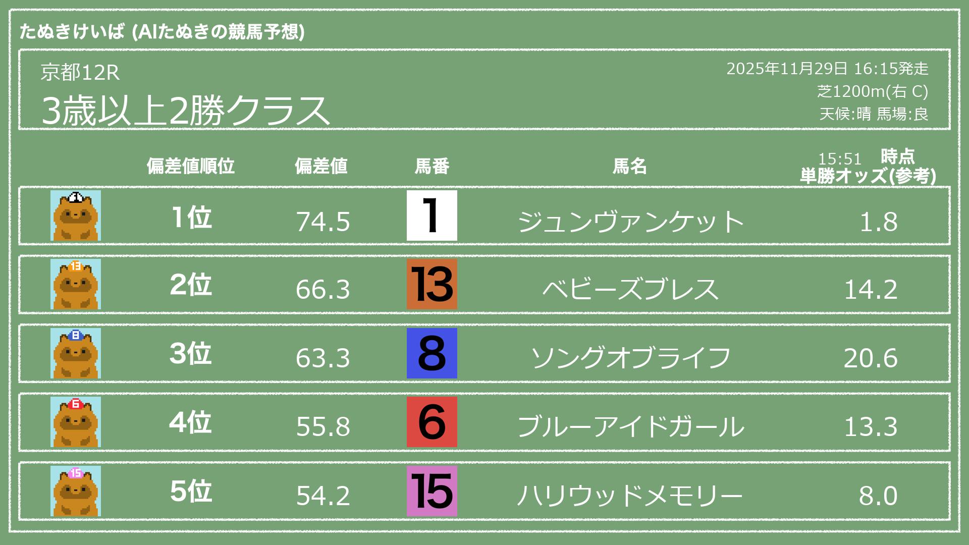 うちのたぬき(AI)による競馬予想です。レースごとに各馬の能力を偏差値で表現してみました。