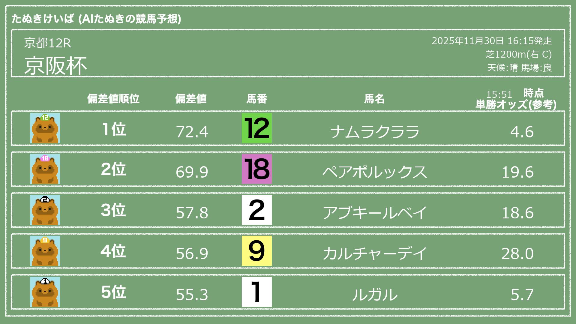 うちのたぬき(AI)による競馬予想です。レースごとに各馬の能力を偏差値で表現してみました。
