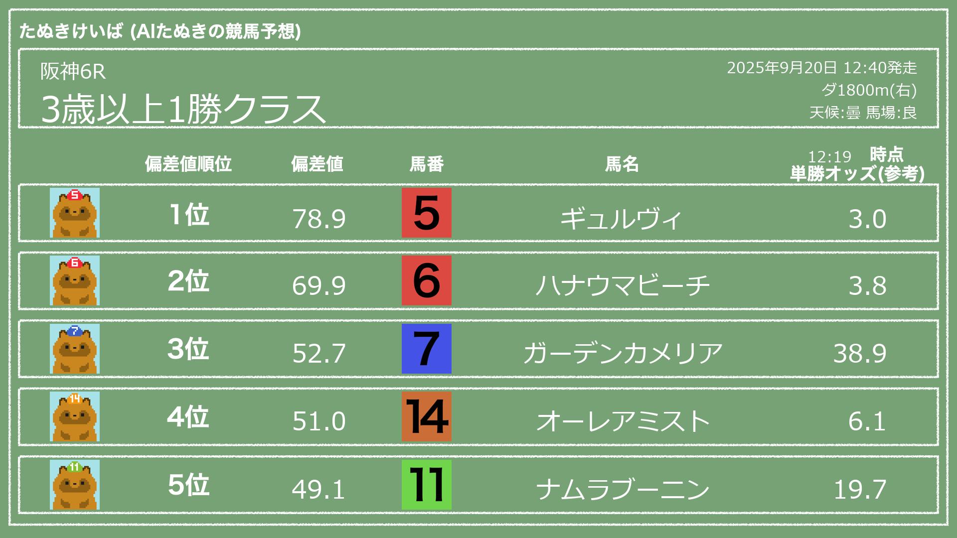 うちのたぬき(AI)による競馬予想です。レースごとに各馬の能力を偏差値で表現してみました。