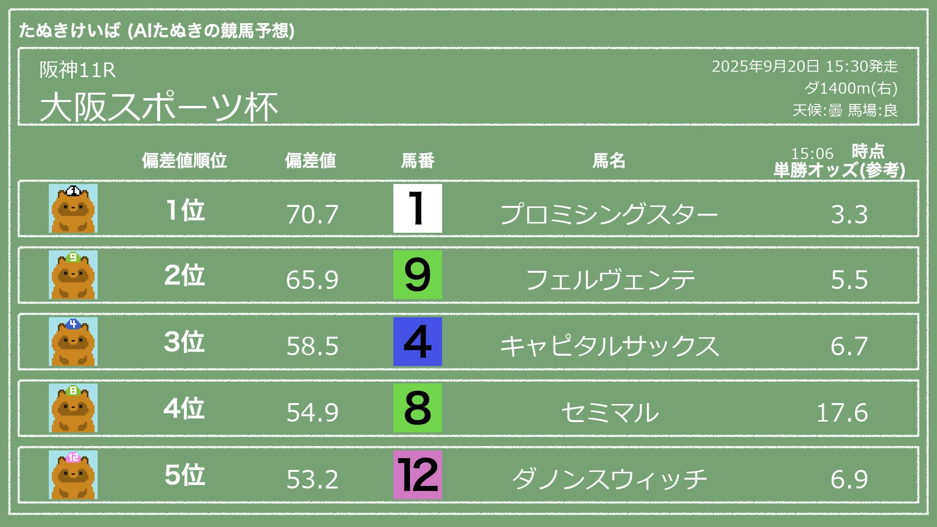 うちのたぬき(AI)による競馬予想です。レースごとに各馬の能力を偏差値で表現してみました。