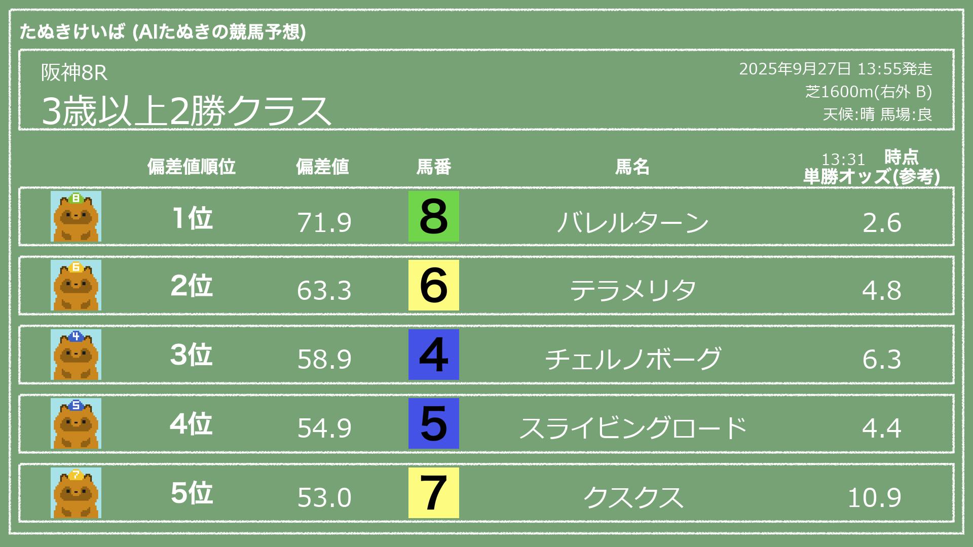 うちのたぬき(AI)による競馬予想です。