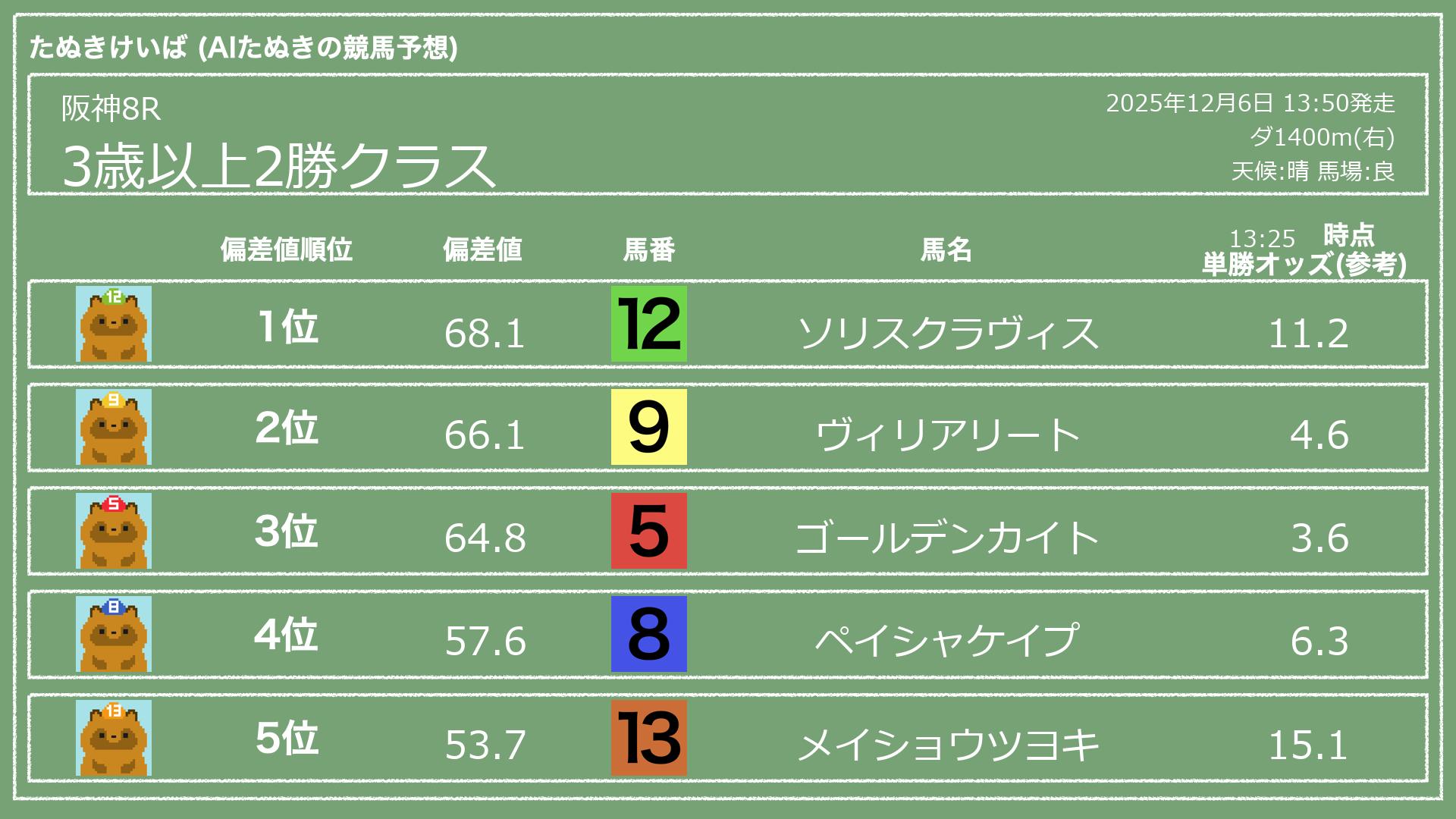 うちのたぬき(AI)による競馬予想です。レースごとに各馬の能力を偏差値で表現してみました。