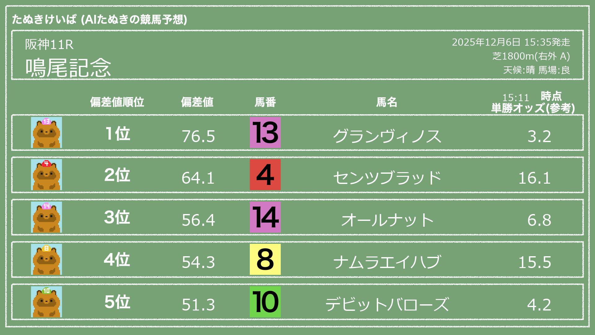 うちのたぬき(AI)による競馬予想です。レースごとに各馬の能力を偏差値で表現してみました。