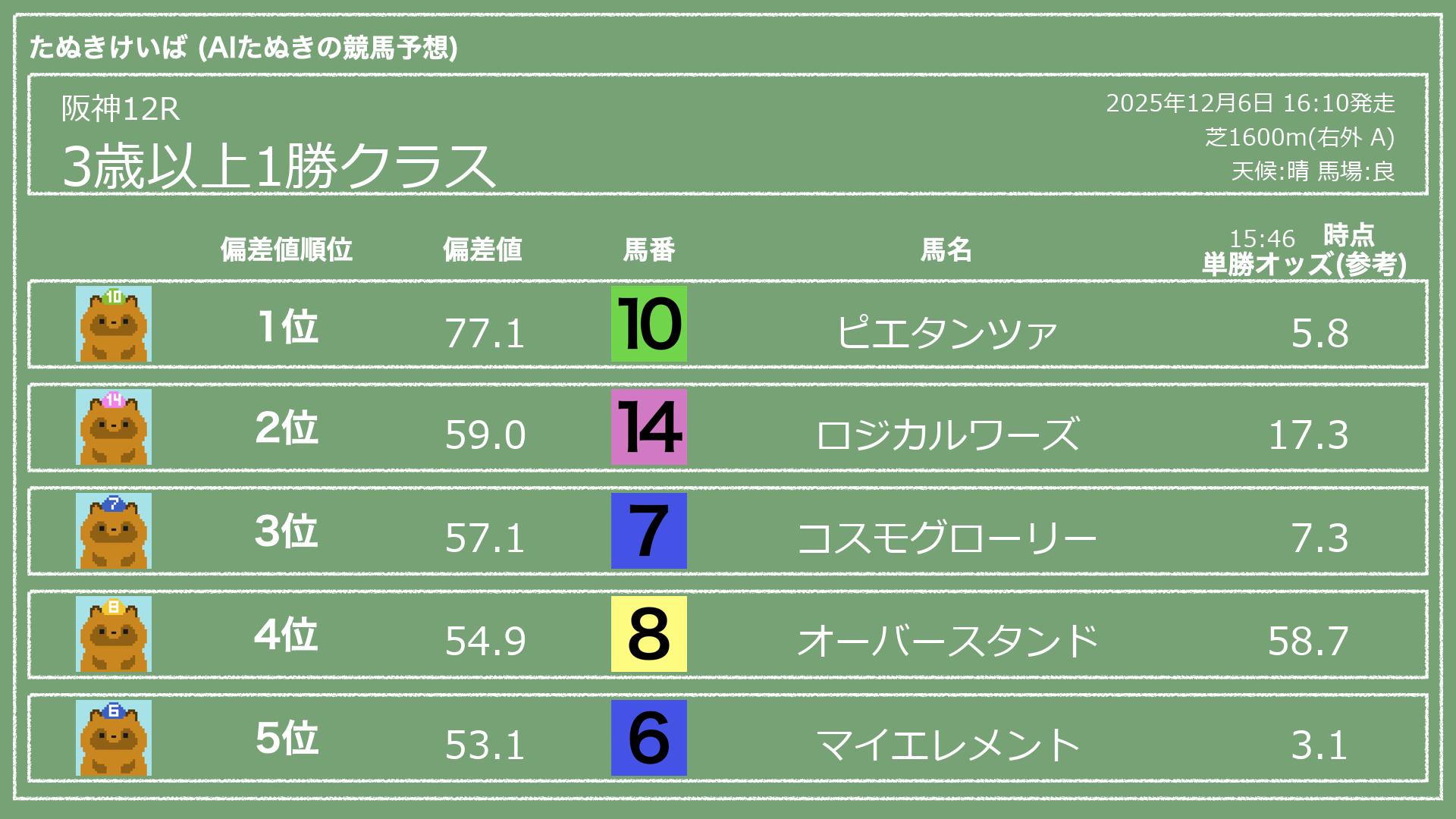 うちのたぬき(AI)による競馬予想です。レースごとに各馬の能力を偏差値で表現してみました。