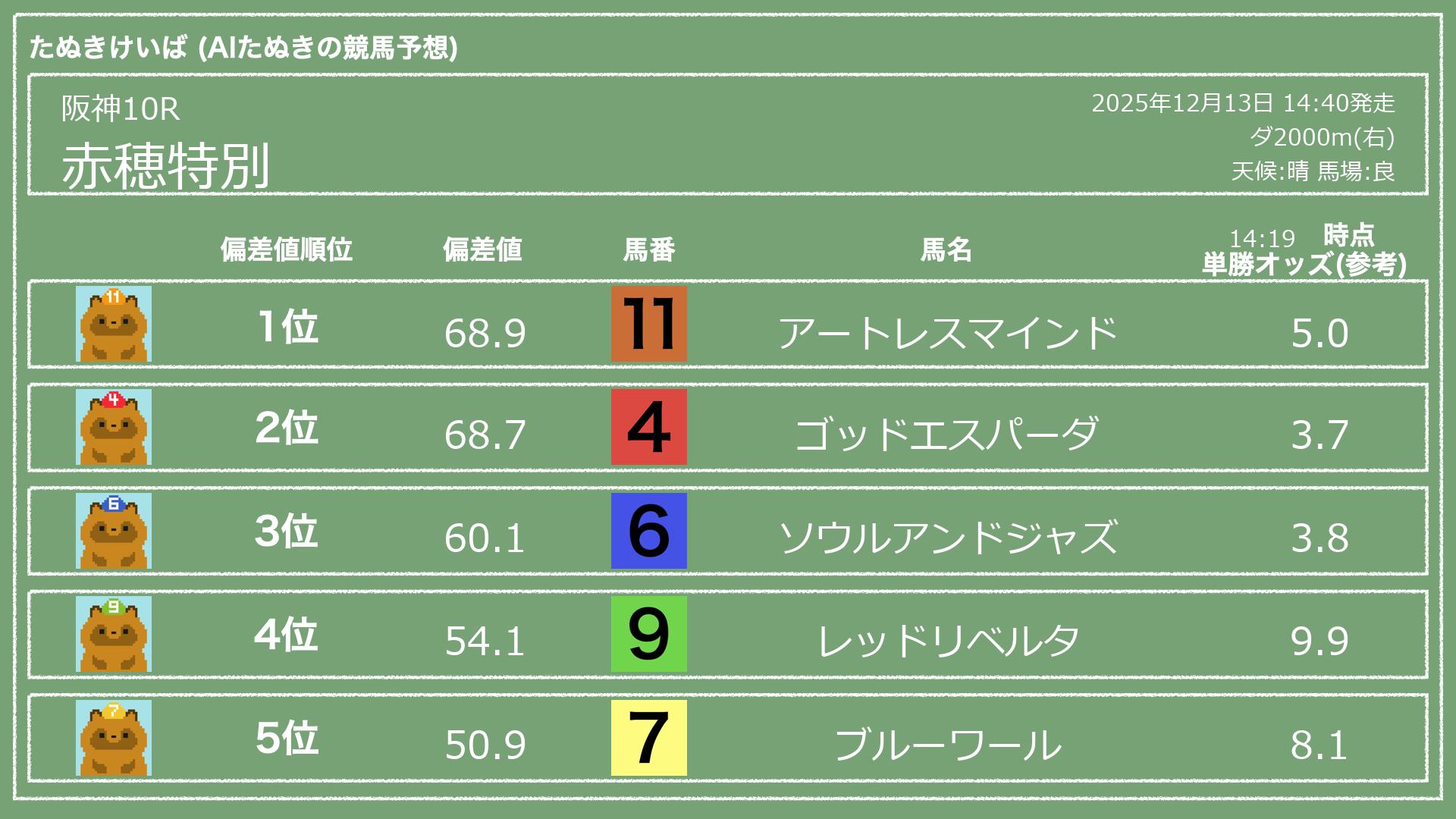 うちのたぬき(AI)による競馬予想です。