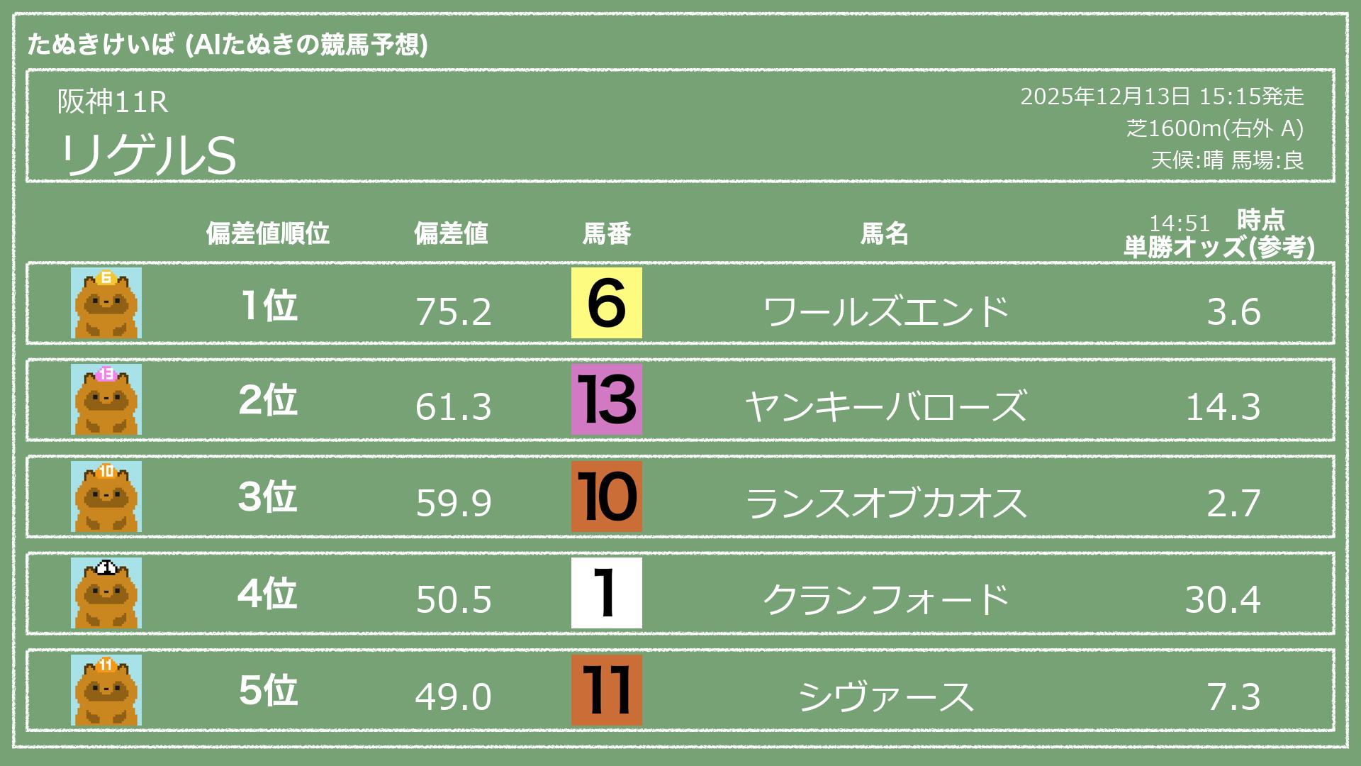 うちのたぬき(AI)による競馬予想です。レースごとに各馬の能力を偏差値で表現してみました。