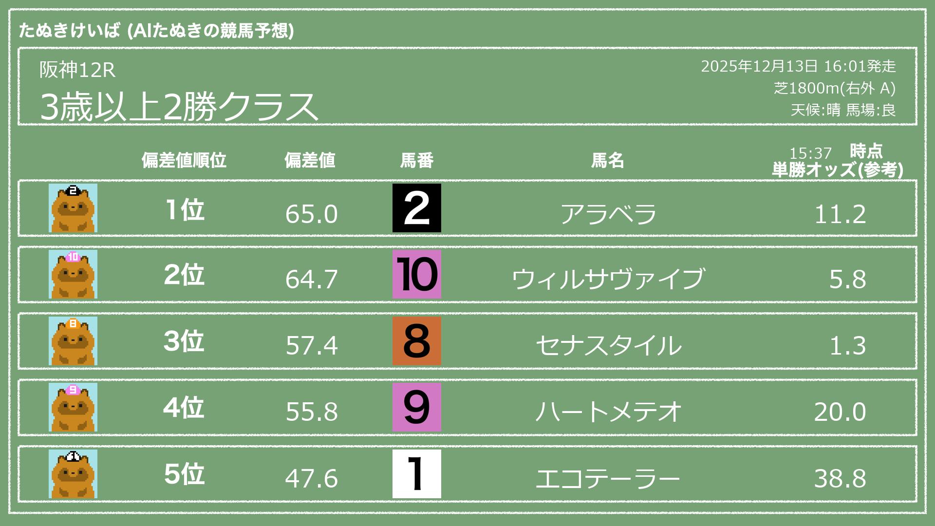 うちのたぬき(AI)による競馬予想です。レースごとに各馬の能力を偏差値で表現してみました。