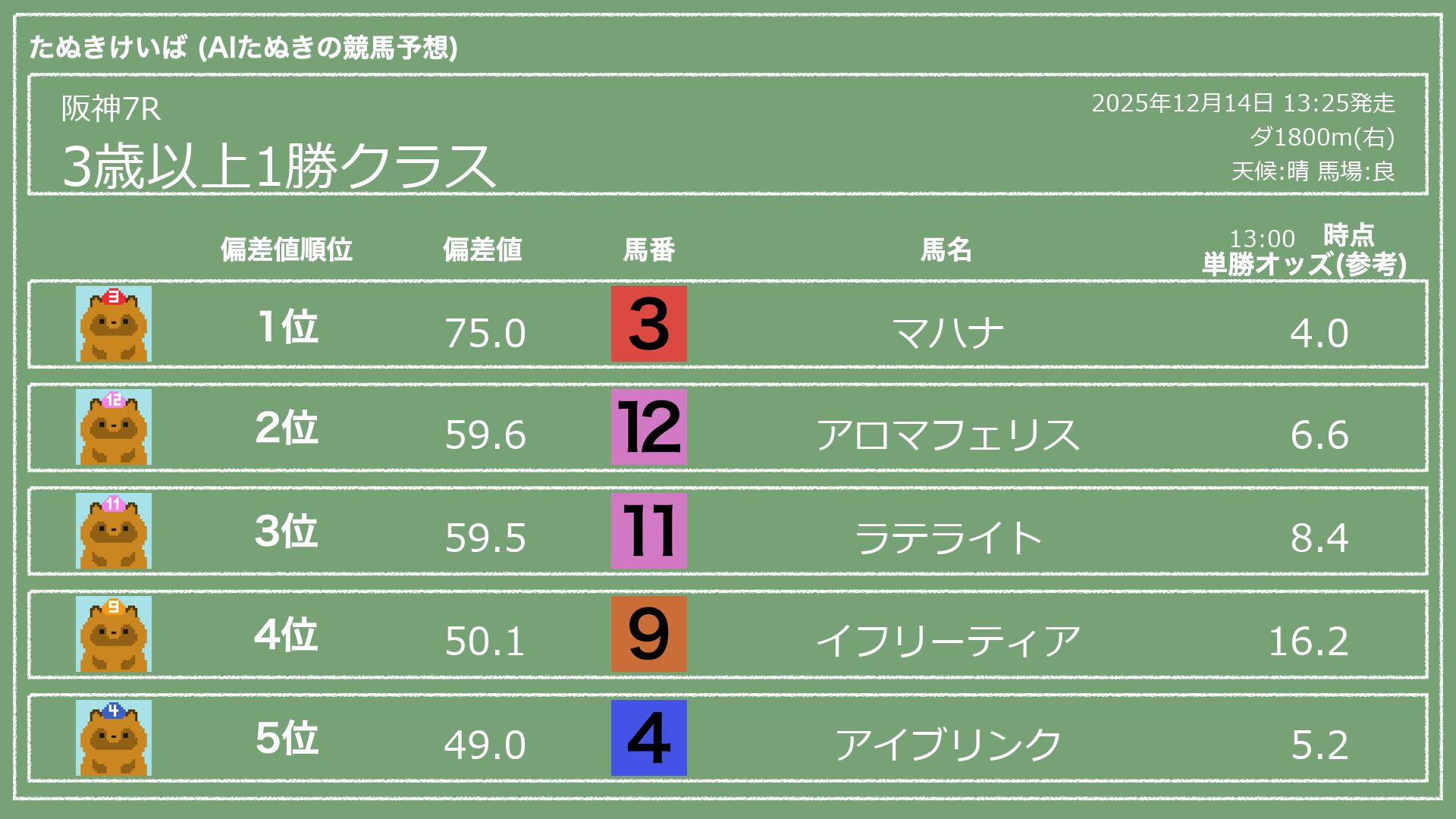 うちのたぬき(AI)による競馬予想です。レースごとに各馬の能力を偏差値で表現してみました。