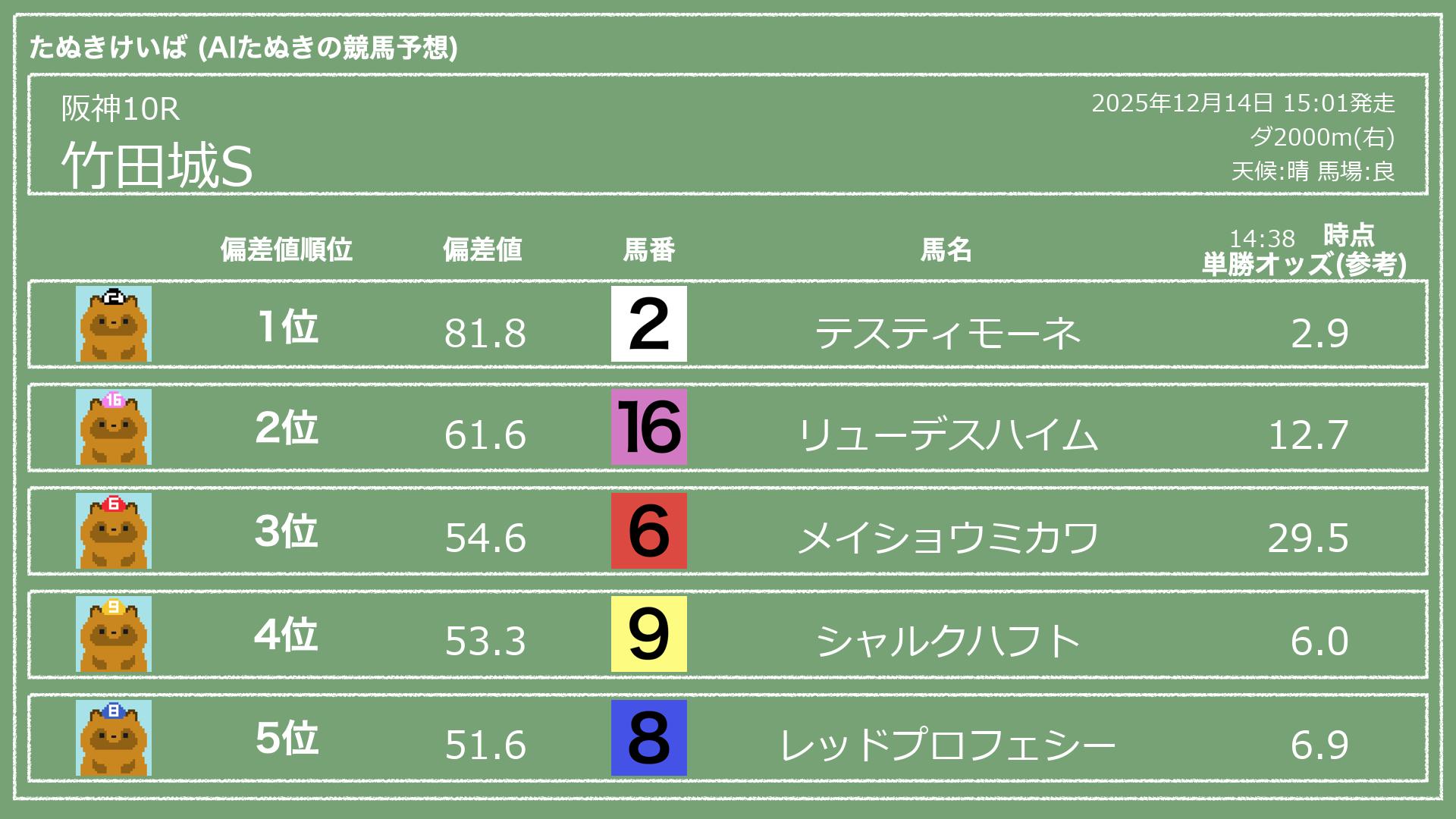 うちのたぬき(AI)による競馬予想です。レースごとに各馬の能力を偏差値で表現してみました。