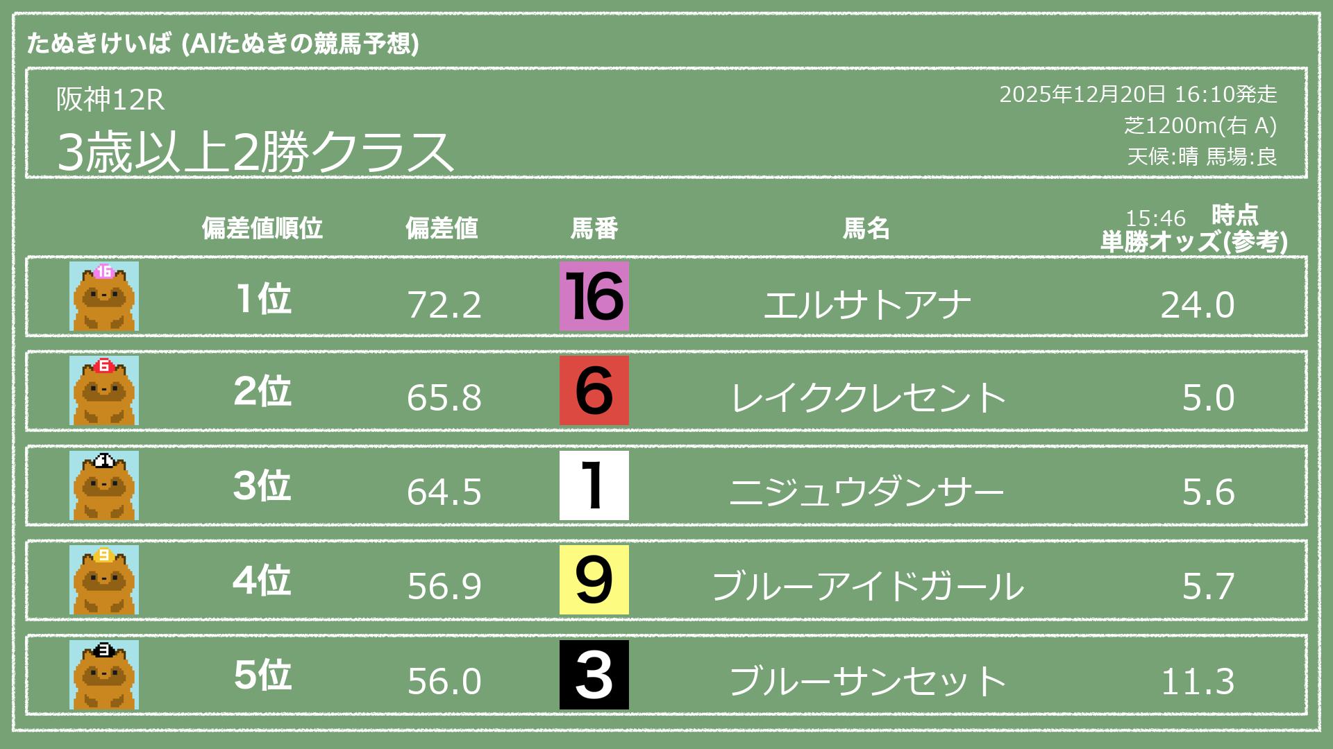 うちのたぬき(AI)による競馬予想です。レースごとに各馬の能力を偏差値で表現してみました。