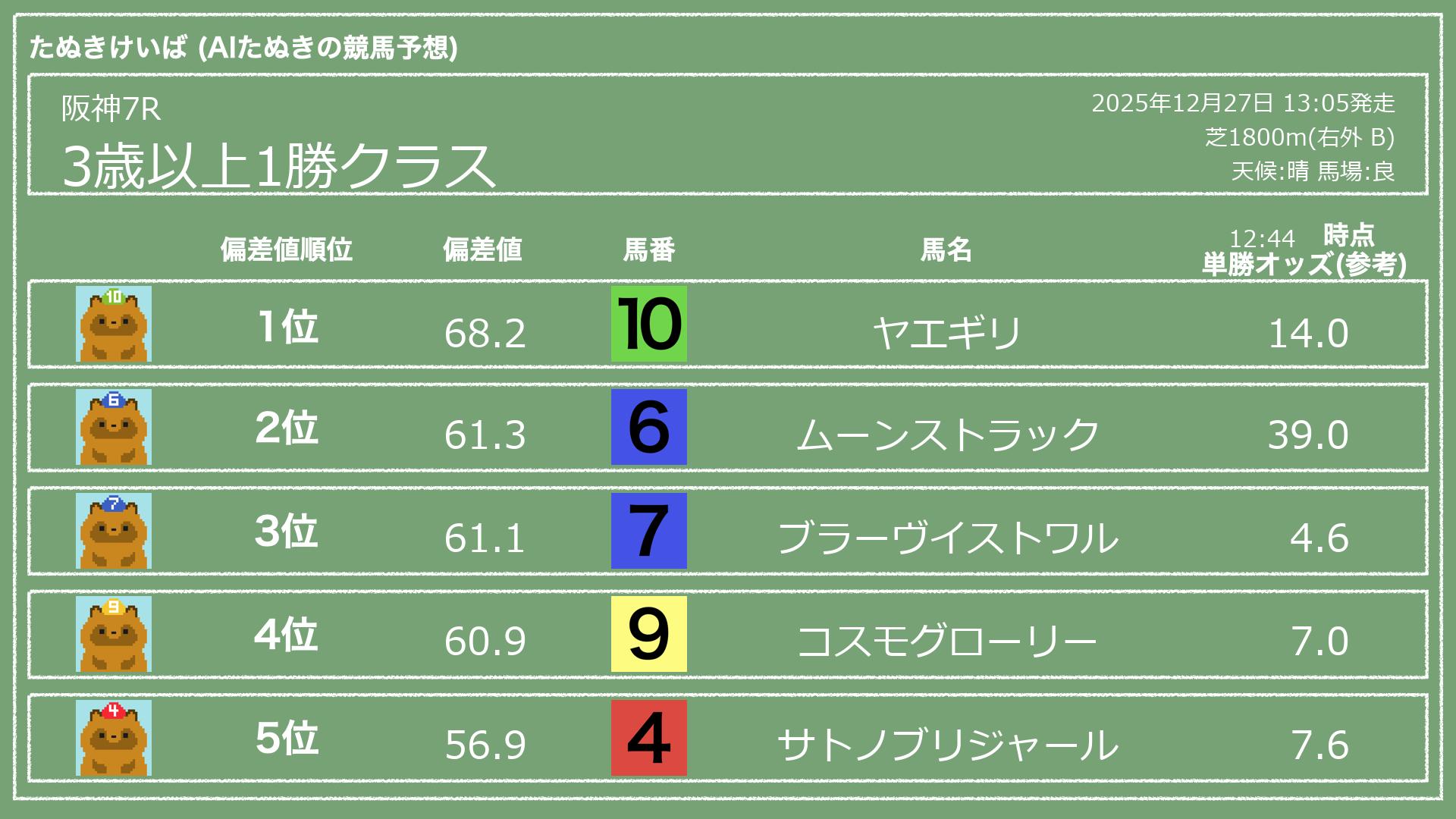 うちのたぬき(AI)による競馬予想です。レースごとに各馬の能力を偏差値で表現してみました。